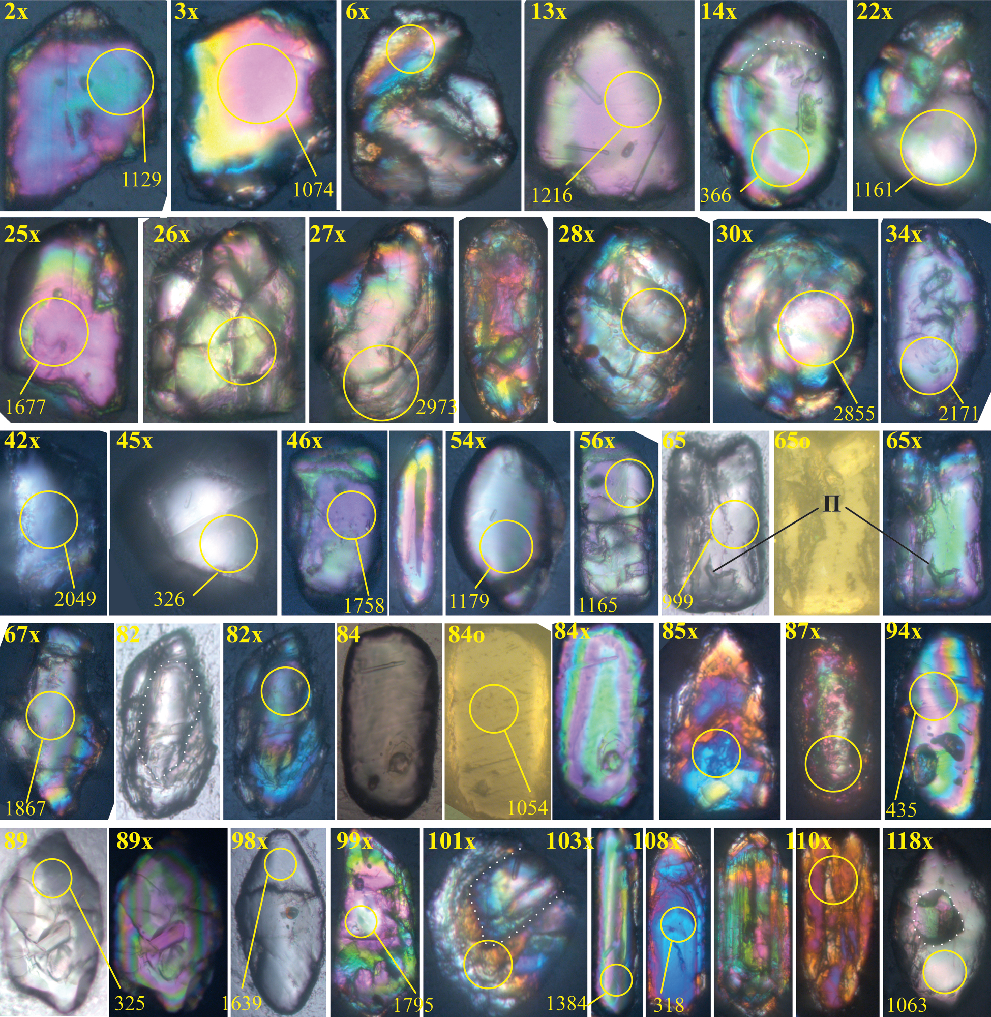 Для каждого изображения в левом верхнем углу указан номер анализа (отсутствует, если пробоотбор не проведен). Индекс “о” означает, что изображение получено в отраженном свете, без индекса – в проходящем свете при параллельных николях, индекс “х” – в проходящем свете при скрещенных николях. Для некоторых зерен показаны два или три изображения. Если был пробоотбор, то показано положение кратера лазерной абляции (кружок, диаметр 25 мк) и возраст зерна в млн лет, если была получена кондиционная датировка. Белыми точечными линиями намечены видимые ядра или границы между разнородными частями внутри зерна.