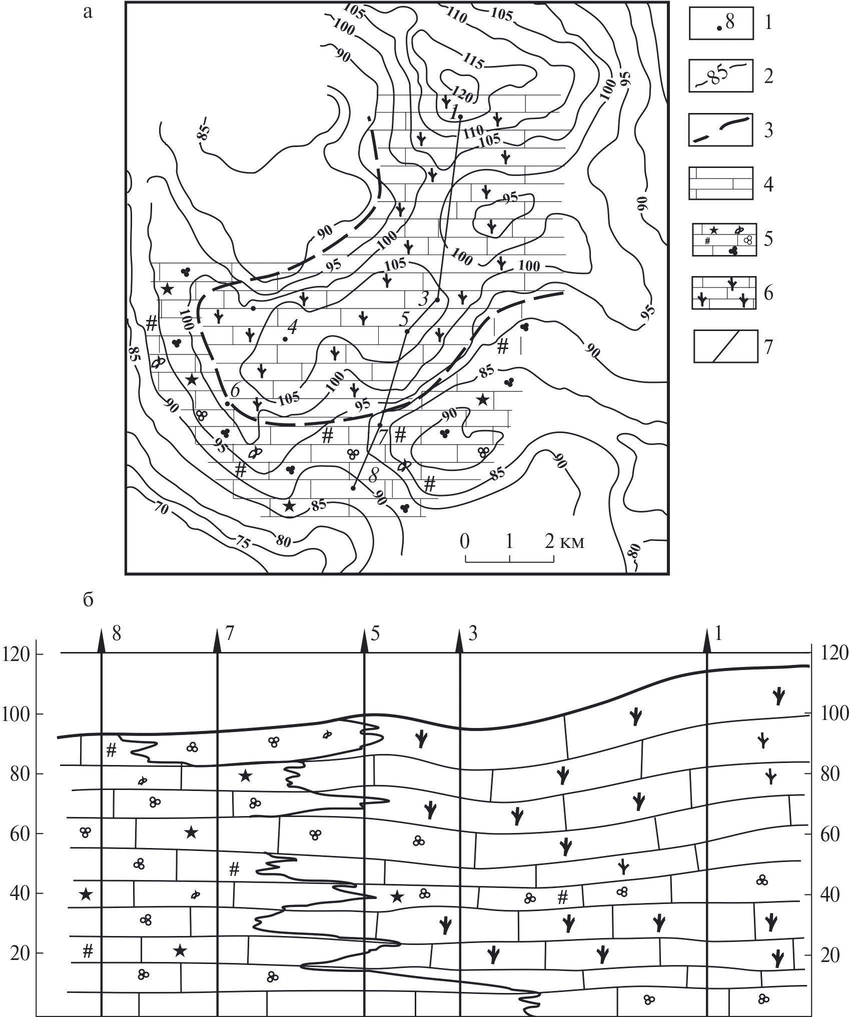 в – палеогеоморфологическое положение относительно уровня моря (а) и современное положение (б); 1 – рифы, 2 – мелководные известняки, 3 – глины, 4 – глинисто-карбонатные депрессионные отложения, 5 – трещиноватость, 6 – водонефтяной контакт.