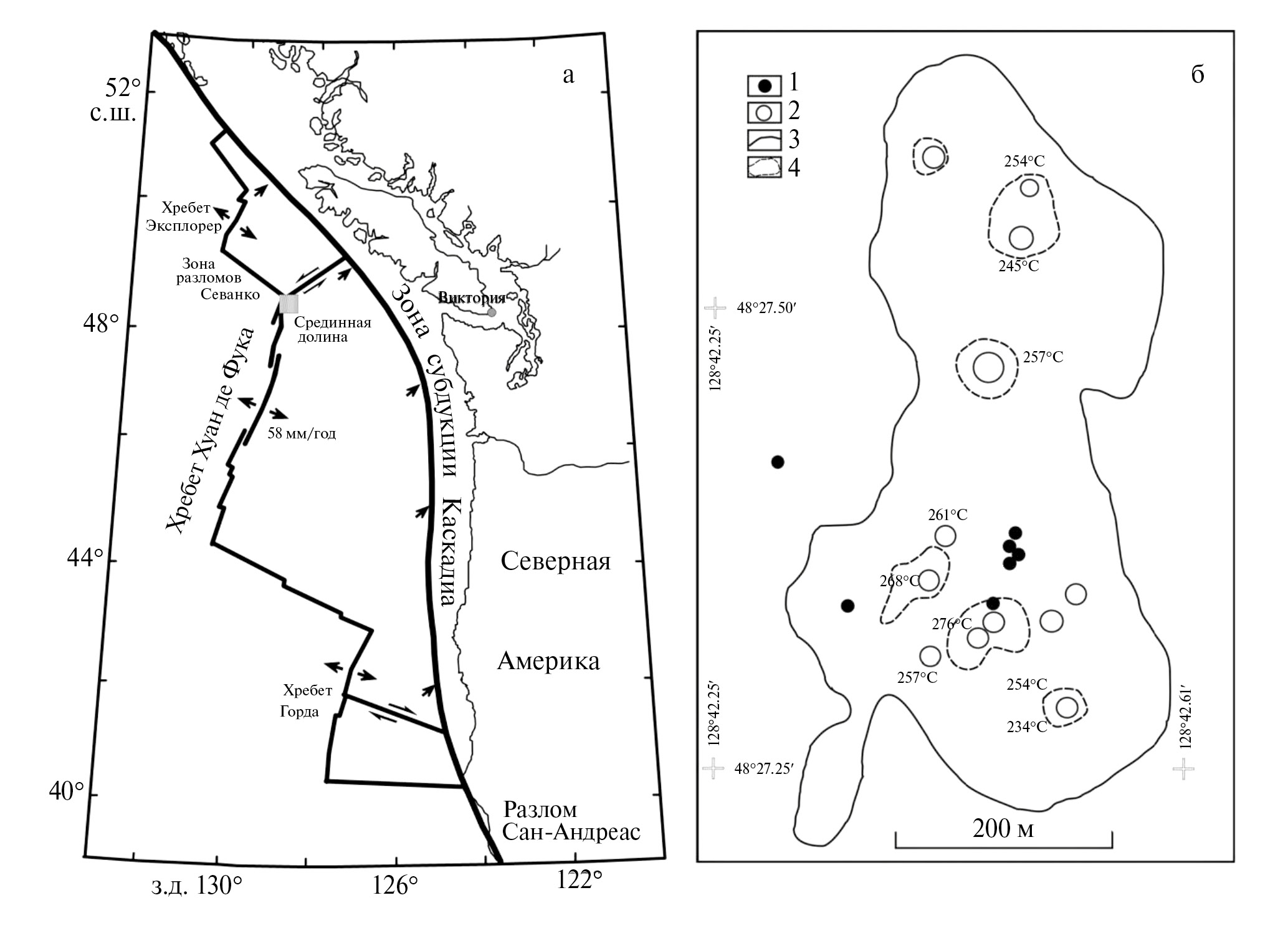 Такому условию удовлетворяет район в Срединной Долине хребта Хуан де Фука с осадочным покровом мощностью 250–300 м, где на гидротермальном поле “Dead Dog” впервые в океане рядом с гидротермальным источником пробурена скв. ODP 858В. Она расположена в 20 м от источника с температурой 276°C [Currey et al., 1982].
