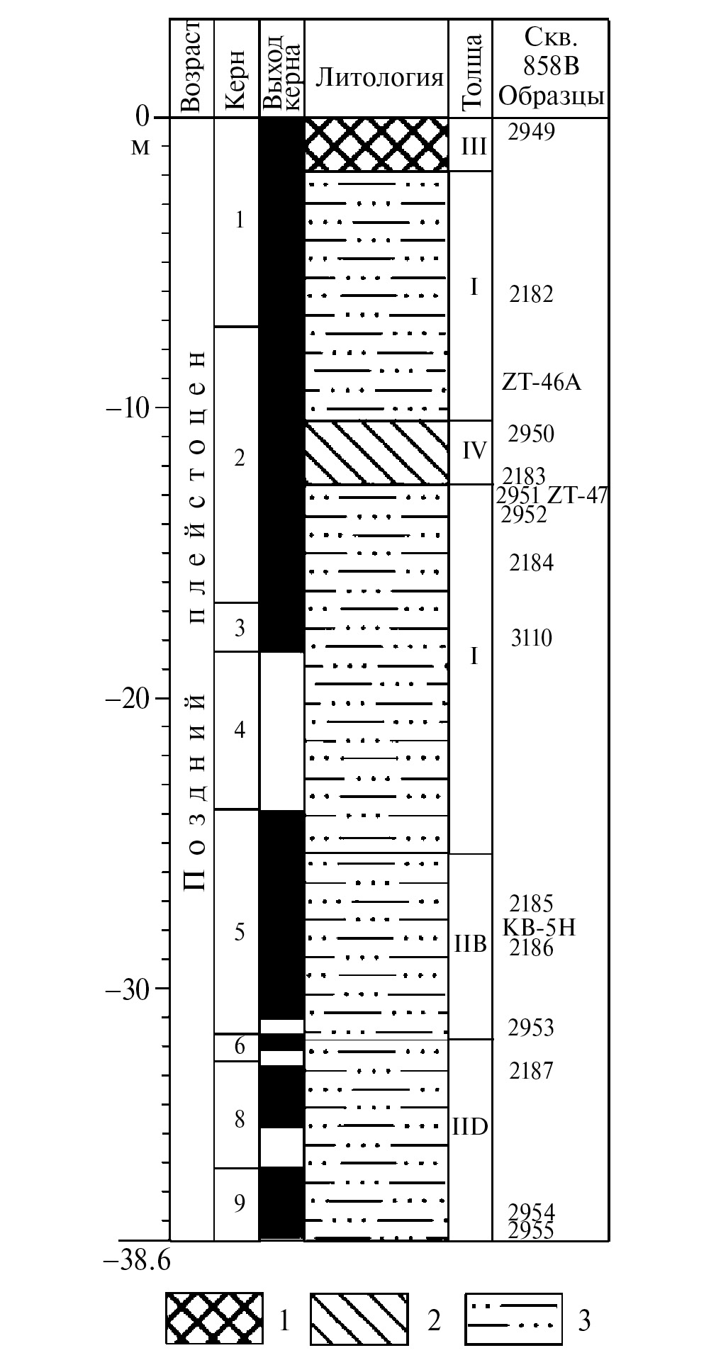 Рис. 2. Литологическая колонка скважины 858В с расположением образцов.