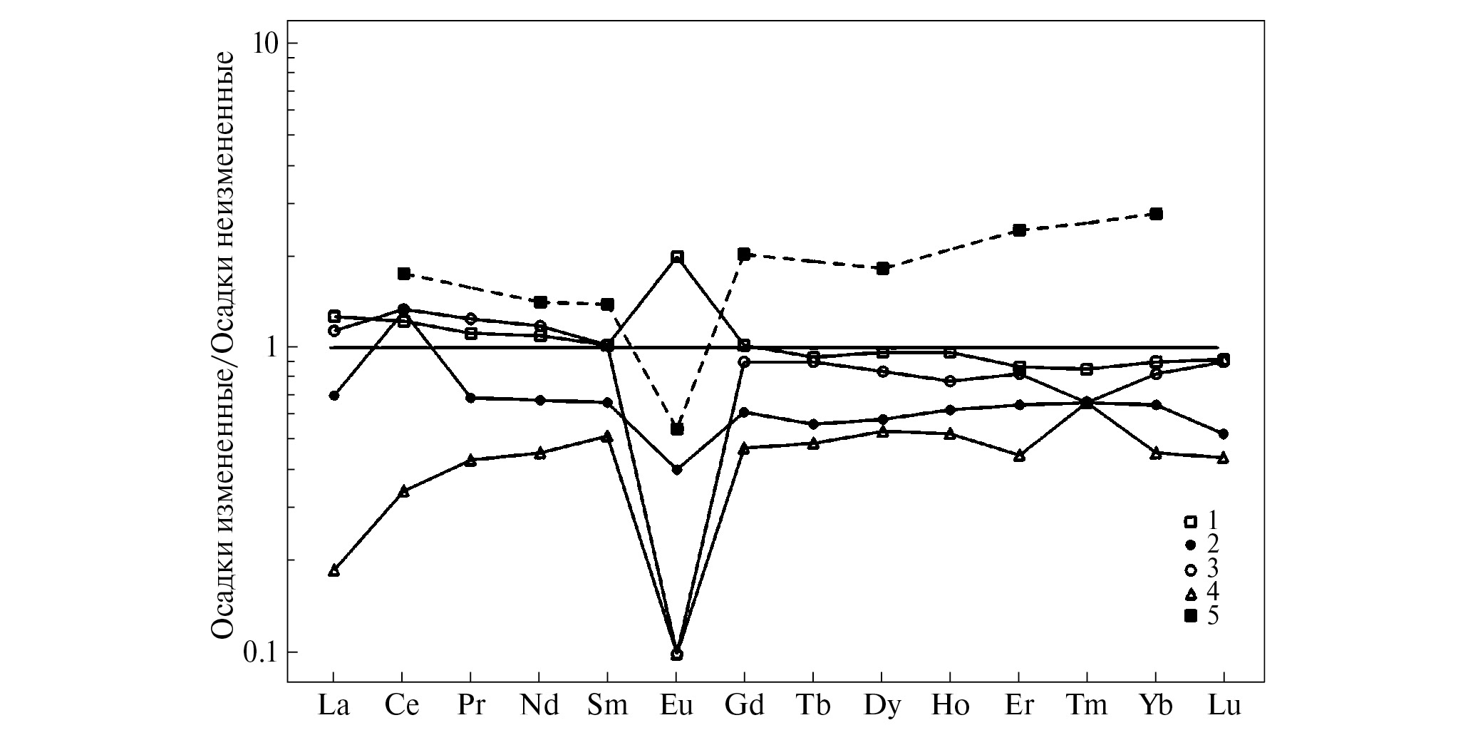 Увеличение в растворе тяжелых РЗЭ (см. рис. 4) может быть связано с трансформацией глинистых минералов и с растворением в осадках полевых шпатов.