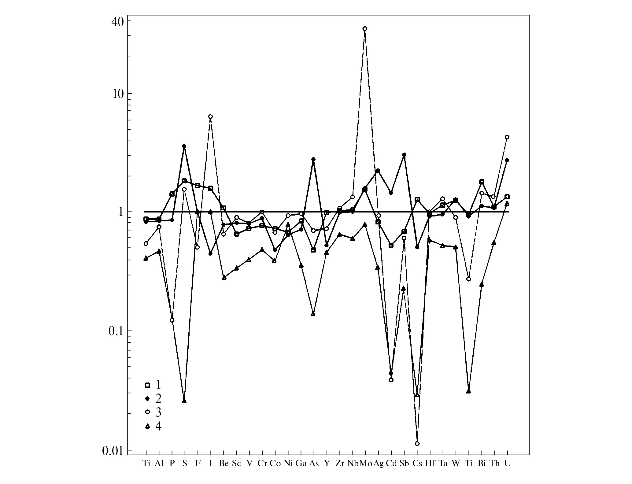 В осадках верхней части Толщи I концентрации всех изученных химических элементов или слабо увеличились (P, S, F, I, Cs, Ta, W, Bi, U), или слабо уменьшились (Ti, Al, Sc, V, Cr, Co, Ni, Ga, As, Ag, Cd, Sb), содержания остальных элементов (Be, Y, Zr, Nb, Hf, Tl, Th) остались без изменения (см. рис. 5).