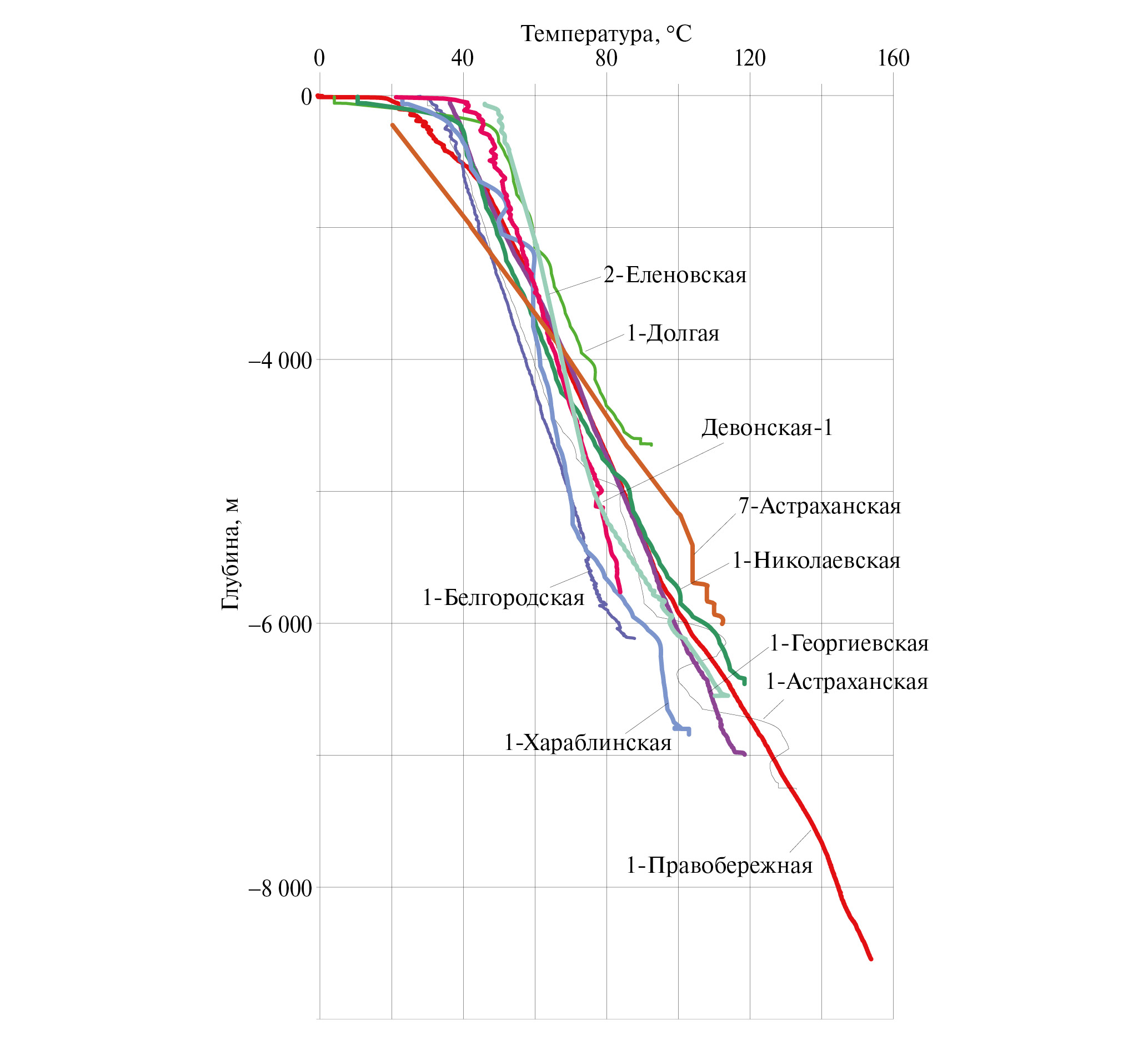 В процессе выполнения данного проекта были проанализированы термограммы еще 18 скважин глубиной от 4 до 6 км, расположенных в пределах Астраханской нефтегазовой провинции (НГП) (рис. 1).