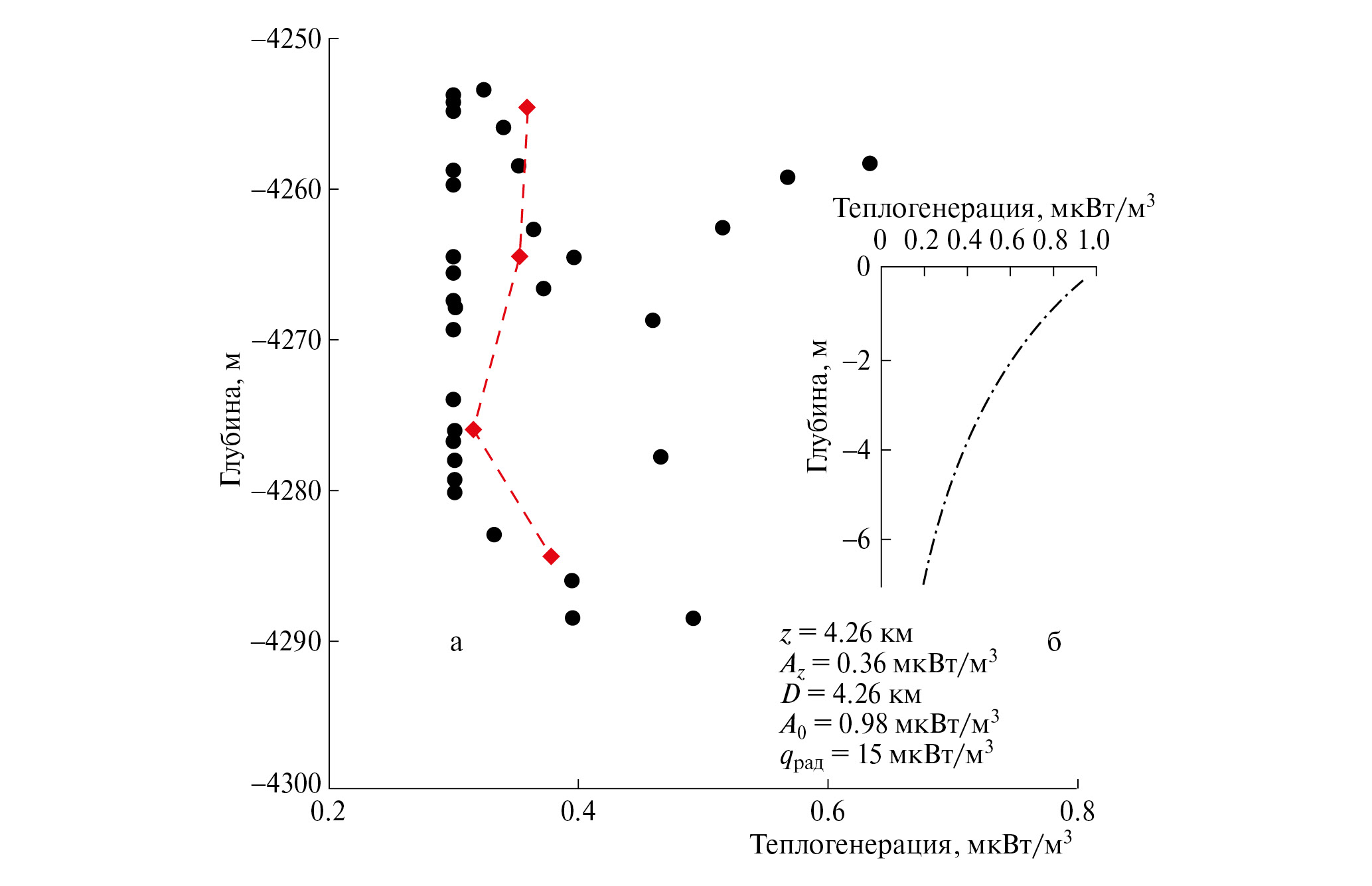 При моделировании температур в призабойных частях глубоких скважин, которые достигают нижних горизонтов подсолевых пород или внедряются в породы кристаллического фундамента, мы обязаны учесть радиогенный тепловой поток, который генерируется в вышележащих породах. Таким образом, в качестве нижнего граничного условия задается, так называемый, редуцированный тепловой поток (qред. = qнабл. − qрад), в котором qрад – это величина теплового потока, генерируемого при распаде долгоживущих изотопов 238U, 232Th и 40К, содержащихся в породах геологического разреза.