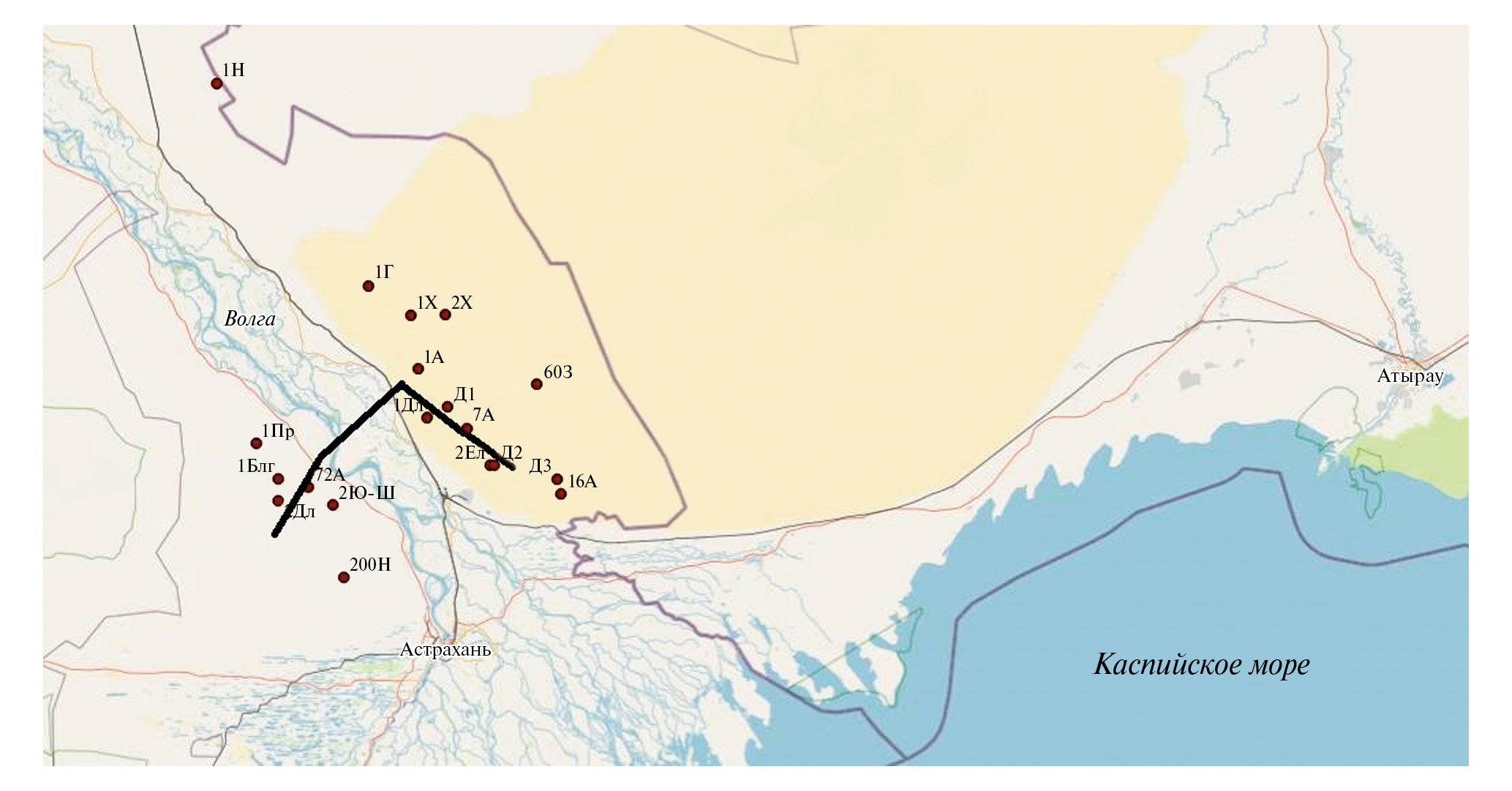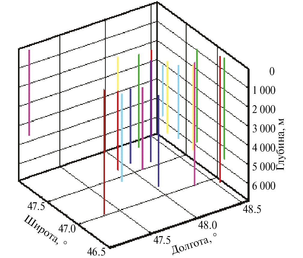 Рис. 8. Пространственное положение исследованных скважин Астраханской НГП и ее окрестностей