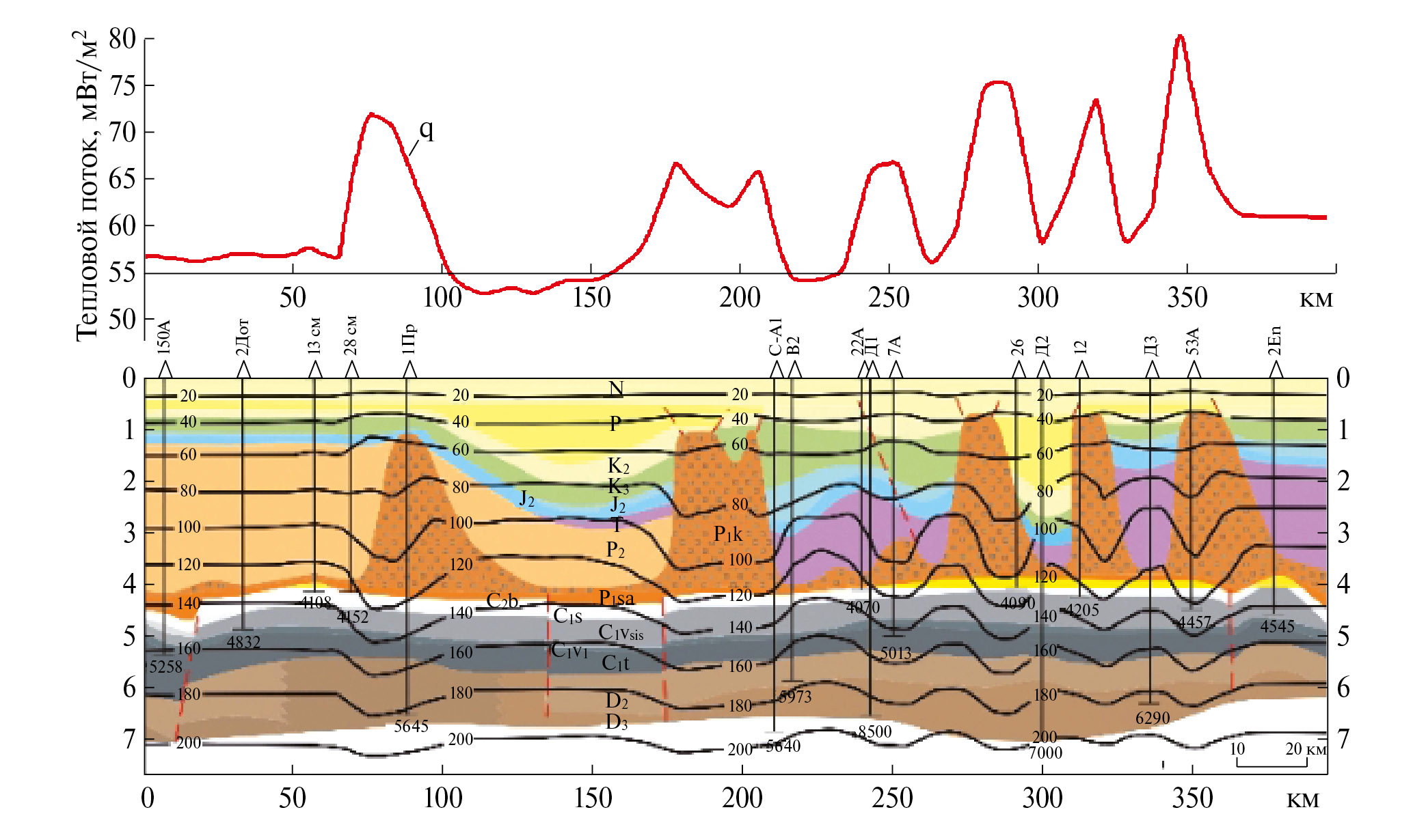 - С помощью численного моделирования методом конечных элементов рассчитан современный тепловой поток вдоль профиля “Еленовский”. Его значения в межкупольных мульдах составляет 52– 55 мВт/м2. Но над соляными куполами тепловой поток повышается до 72– 75 мВт/ м2. Такие вариации связаны с рефракцией глубинного теплового потока в условиях структурно-теплофизических неоднородностей из-за контраста теплопроводности эвапоритов (4.5–5.3 Вт/ (м∙К)) и вмещающих терригенных пород надсолевого комплекса (1.8–1.9 Вт/(м∙К)). Температурные условия катагенеза органического вещества (ОВ) в современном разрезе отмечаются в интервале глубин 4.5–5.0 км.