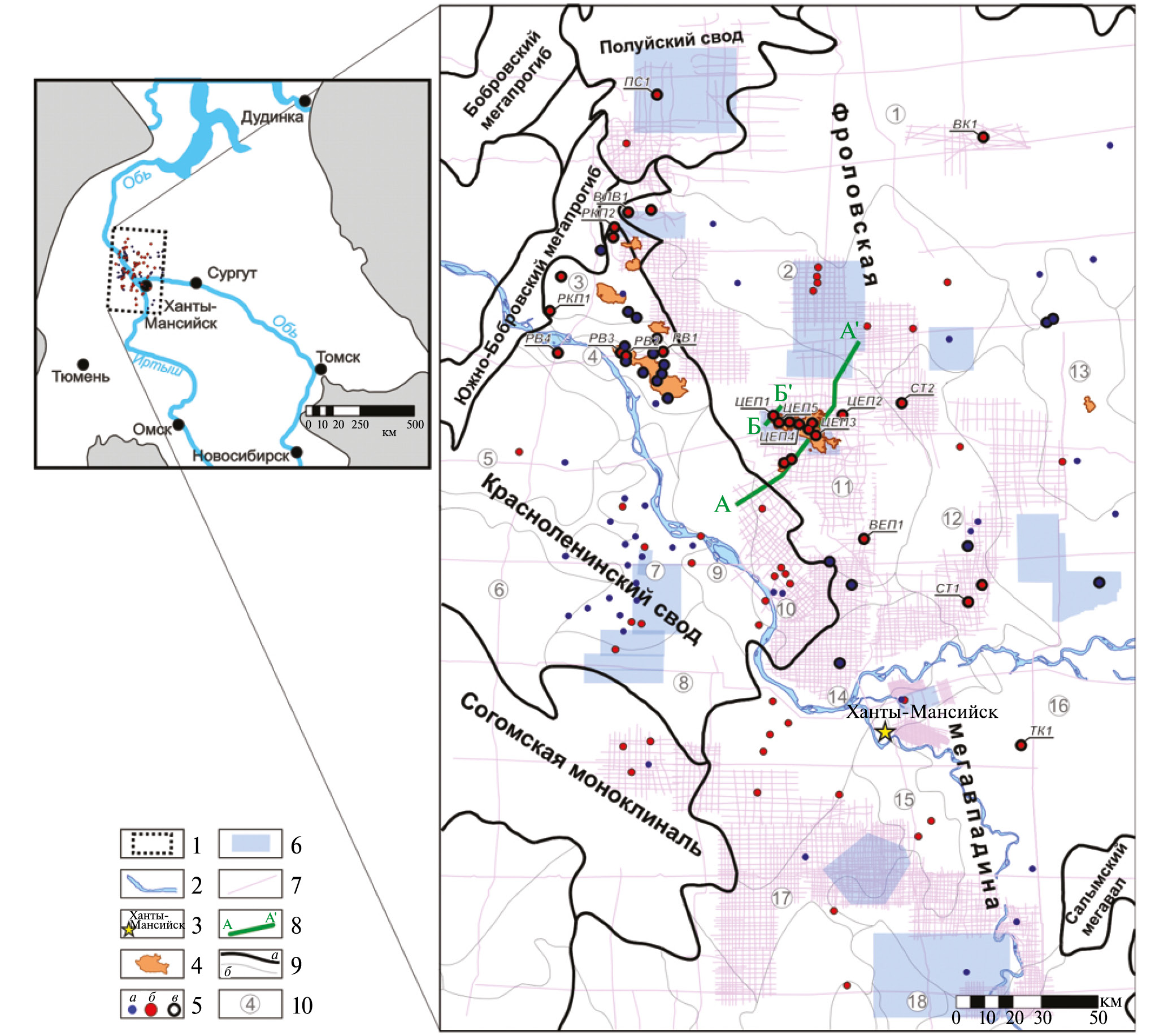 Территория наших исследований охватывает площадь более 60 тыс. км2 и приурочена к центральной части Западной Сибири, в пределах Ханты-Мансийского автономного округа (ХМАО). Район проведенных работ занимает область Фроловской мегавпадины, Красноленинского свода и их окружения (здесь и далее – районирование по [Атлас …, 2004]) (рис. 1).