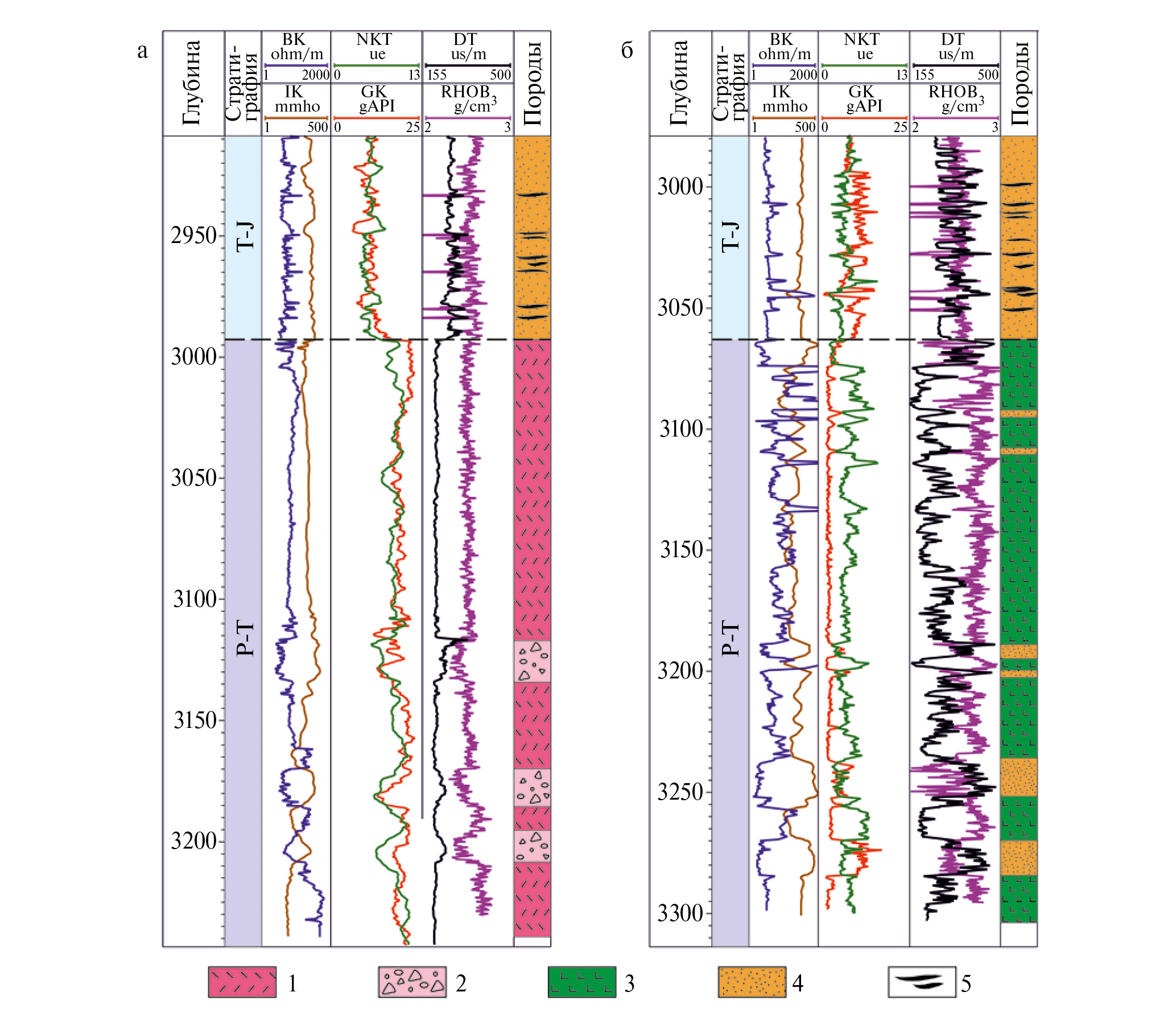 Петрографический и химический состав пермско-триасовых вулканитов Западно- Сибирской плиты слабо освещен в литературе и касаются преимущественно Рогожниковского месторождения [Кропотова и др., 2007; Архипов и др., 2009; Шадрина, 2009; Шадрина, Крицкий, 2012]. Одной из основных задач проведенного нами исследования являлось выделение ключевых петротипов пермско-триасовых кислых вулканических пород с учетом не только петрографических свойств, но и каротажных характеристик для того, чтобы эти петротипы могли быть прослежены и спрогнозированы посредством геофизических методов. В работе также демонстрируются подходы к изучению вулканитов с целью выделения коллекторов, выявления факторов, которые влияют на их свойства и распределение в разрезе. В результате комплексирования геолого-геофизических данных удалось выявить и проследить некоторые грабенообразные структуры, сложенные кислыми пермско-триасовыми вулканитами, что позволяет произвести оценку объемов развития коллекторов в исследуемом районе.