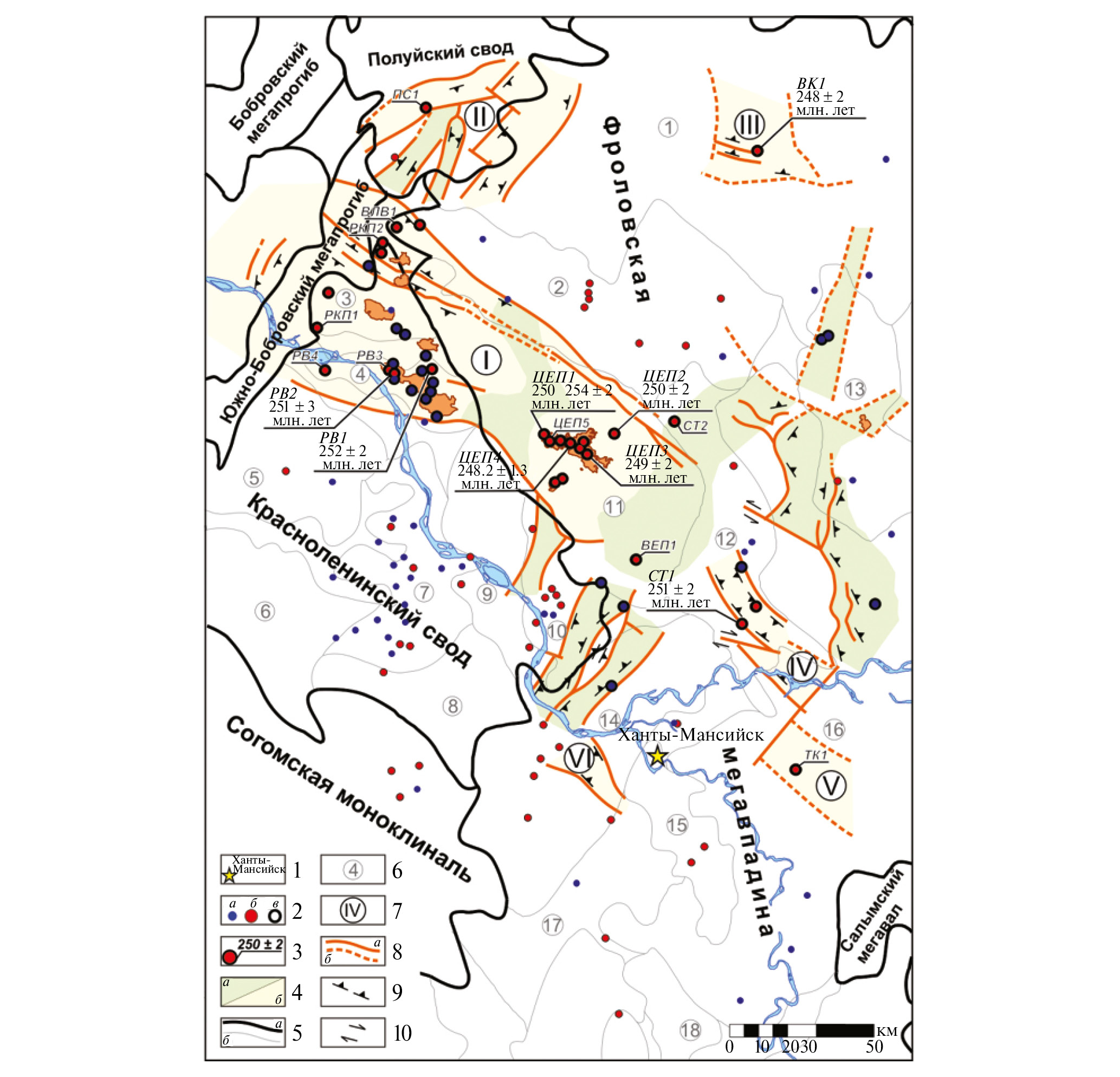 1 – территория работ; 2 – реки; 3 – города; 4 – залежи нефти в P-T комплексе; 5 – скважины: а – с ГИС, б – с ГИС и изученным керном, в – в которых обнаружен P-T комплекс; 6 – сейсмика 3D; 7 – сейсмические профили 2D; 8 – сейсмические профили, представленные в работе; 9 – границы структурных элементов 1 порядка (а) и 2 порядка (б); 10 – названия структурных элементов, по [Атлас …, 2004]: 1 – Вынглорская котловина, 2 – Верхнеляминский вал, 3 – Рогожниковское куполовидное поднятие, 4 – Рогожниковский вал, 5 – Ем-Еговская вершина, 6 – Талинская терраса, 7 – Каменная вершина, 8 – Елизаровский склон, 9 – Водораздельный прогиб, 10 – Галяновский выступ, 11 – Елизаровский прогиб, 12 – Сыньеганская терраса, 13 – Туманный вал, 14 – Южно-Елизаровский прогиб, 15 – Эргинский вал, 16 – Тундринская котловина, 17 – Ташинская терраса, 18 – Ендырский вал