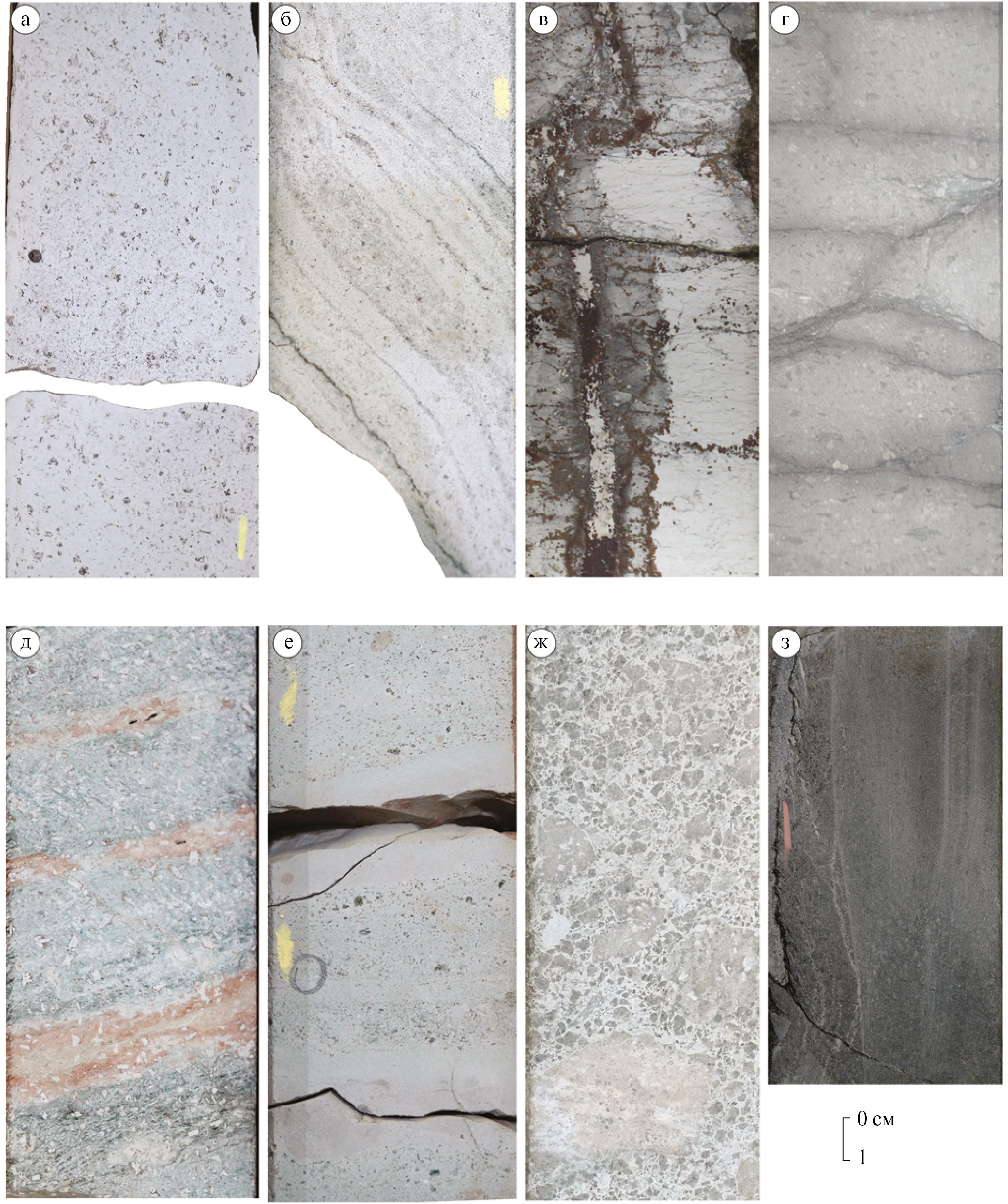 Базовым источником информации для данной работы послужил керн, так как породы ДЮК не выходят на дневную поверхность и не доступны для изучения в обнажениях. На первом этапе исследований проведено макроскопическое описание керна из интервала ДЮК всех доступных для изучения скважин. Описание керна всех скважин выполнено по единой структуре с указанием: названия пород, характеристики структуры, текстуры и трещиноватости, минерального состава (различимые глазом компоненты), особенностей вторичных изменений, характера контактов с подстилающими и перекрывающими образованиями. При классификации пород и их описании использовалась терминология и рекомендации Петрографического кодекса России [Петрографический …, 2008, 2009].