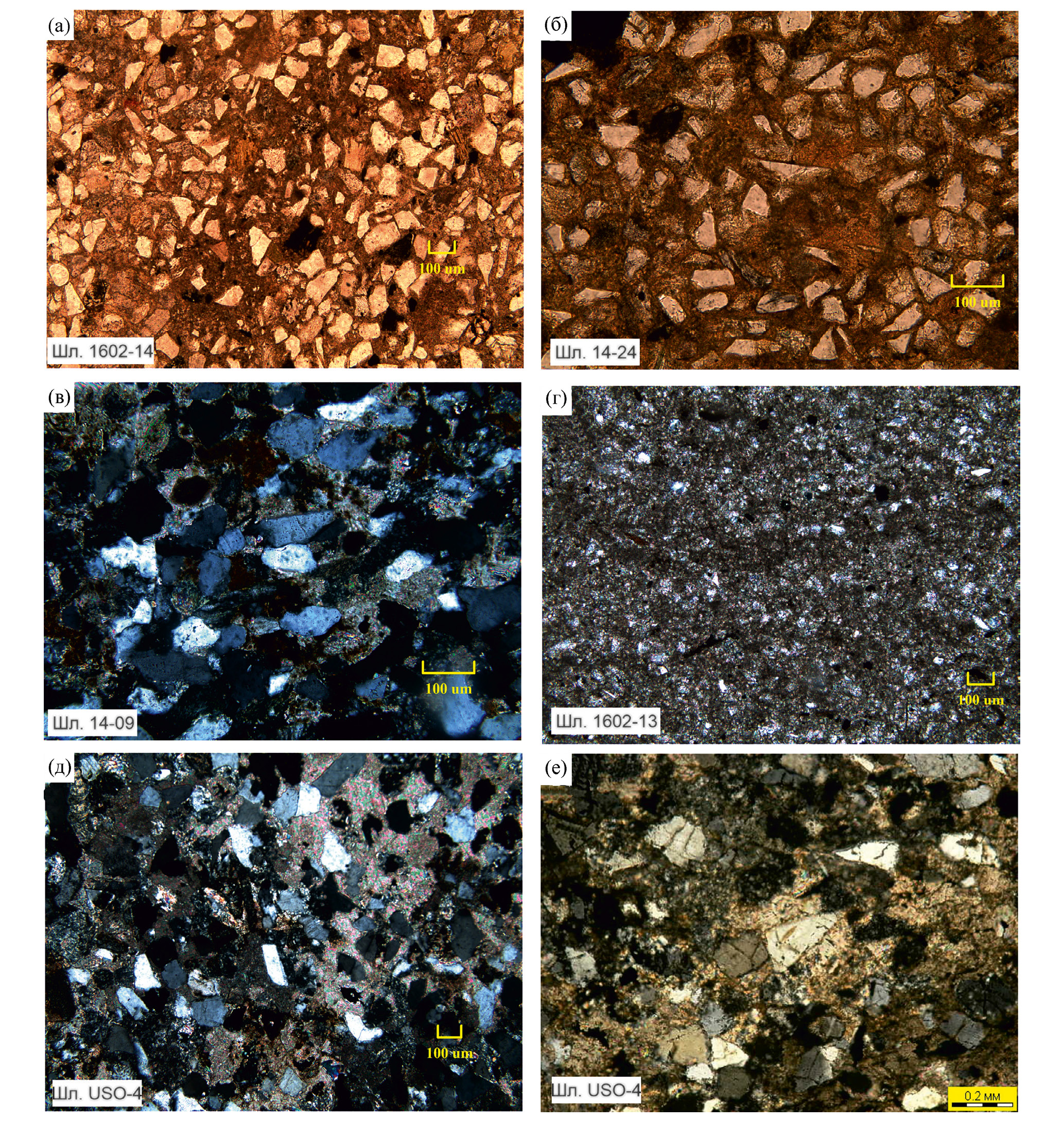 а – кварц-полевошпатовый хорошо сортированный песчаник с базальным цементом смектит-хлоритового состава, замещенным кальцитом. Много угловатых кварцевых зерен с острыми краями, обр. 1602-14, без анализатора; б – мелкозернистый кварц-полевошпатовый алевропесчаник, сцементированный смектит-хлоритовой массой, замещенной кальцитом. Кварцевые зерна преимущественно остроугольные, обр. 14-24, без анализатора; в – мелкозернистый кварц-полевошпатовый песчаник, сцементированный агрегатами гидроокислов железа и железистым карбонатом, кварцевые зерна преимущественно округлые и остроугольные со сглаженными краями, корродированные железистым карбонатом, обр. 14-09, с анализатором; г – известняк микритовый с терригенной примесью в количестве 10–15%, наблюдается микрослоистость и следы биотурбаций, обр. 1602-13, без анализатора; д – кварц-полевошпатовый алевропесчаник с базальным кальцитовым и доломитовым цементом, участками корродирующим зерна. Кварцевые зерна округлые, редко угловатые корродированные, редко встречаются зерна кварца с микротрещинами обр. USO-4; д – кварц-полевошпатовый алевропесчаник с остроугольными кварцевыми зернами с микротрещинами, обр. USO-4.