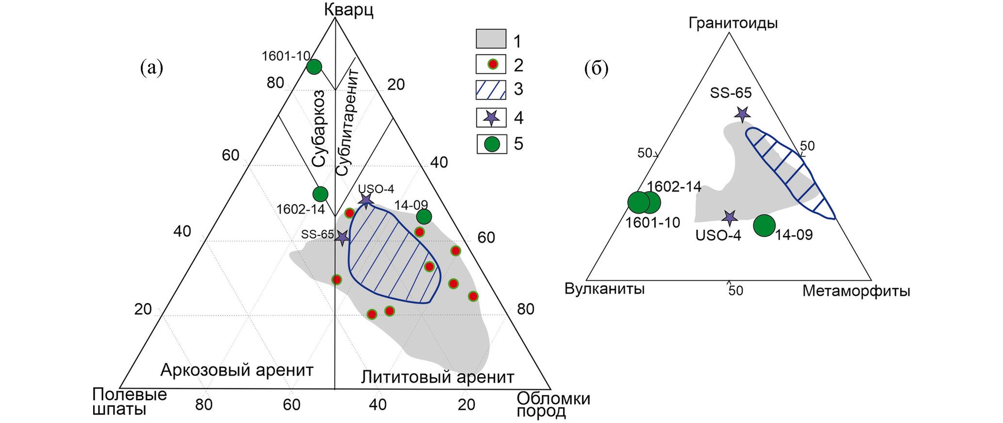 На классификационной диаграмме состава породообразующих компонентов Ф. Петтиджона [Pettijohn, 1975] (рис. 3а) проанализированные образцы располагаются в полях субаркозовых песчаников (обр. 1601-10), аркозовых (обр. 1602-14) и лититовых аренитов (обр. 14-09, USO-4 и SS-65).