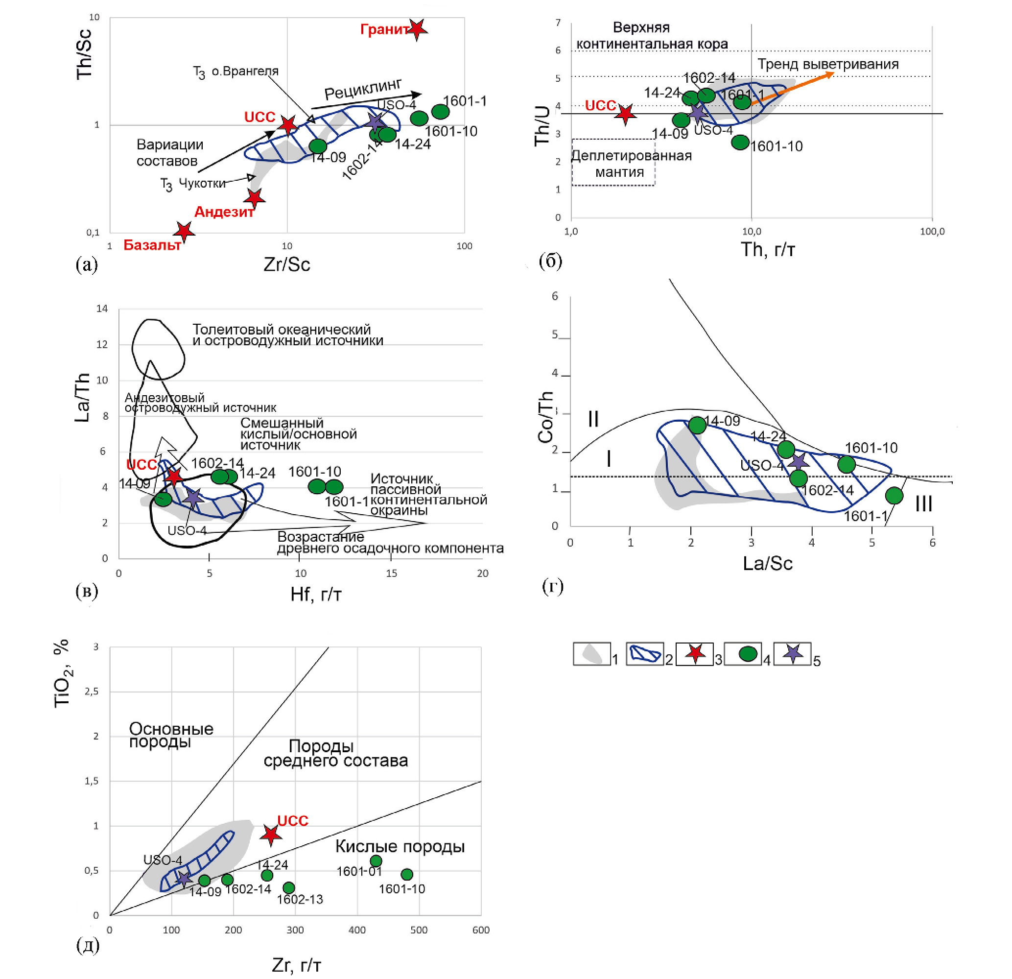 Влияние континентальной коры на осадконакопление отражает соотношение Th/U [McLennan et al., 1993], а соотношения Th–Th/U на диаграмме (см. рис. 4б) позволяет проследить тренд выветривания в питаюшей провинции. На диаграмме Th‒Th/U в образцах USO-4, 1601-1, 1602-14 и 14-24 отношение Th/U выше 3.8, что характерно для размыва верхней континентальной коры (UCC), и они располагаются в поле верхнетриасовых пород Чукотки и о. Врангеля. Положение образца 1601-1, смещенное в сторону более высокой концентрации Th, указывает на более интенсивное выветривание в питающей провинции или размыв рециклированных пород. Вероятнее предполагать второе, так как на графике Th/Sc–Zr/Sc этот образец занимает положение, соответствующее максимальному уровню переотложения обломочного материала среди проанализированных образцов. Два образца 14-09 и 1601-10 располагаются ниже линии 3.8, что, скорее всего, указывает на размыв преимущественно вулканогенных пород, но с разным уровнем выветривания в питающей провинции (повышенным в обр. 1601-10 и пониженным в обр. 14-09).