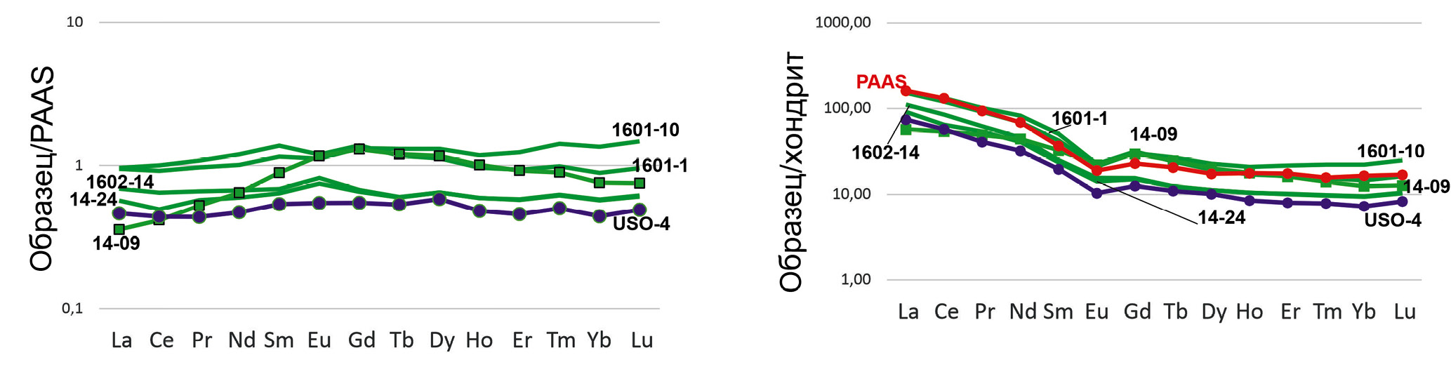 Распределение редкоземельных элементов (РЗЭ) во всех изученных образцах имеет схожую картину – как на графике, где образцы нормированы на PAAS, так и на графике с нормированием на хондрит (рис. 5а, 5б). Образцы незначительно отличаются по уровню концентраций РЗЭ, при этом кривая спектра образца USO-4 занимает самую нижнюю позицию, отражая наиболее низкие содержания этих элементов в нем; а наиболее высокие концентрации РЗЭ наблюдаются в образцах 1601-1, 1601-10. Заметим, что график образца 14-09 на диаграмме с нормированием на PAAS отличается от других образцов (см. рис. 5а). Линия спектра данного образца постепенно поднимается от тяжелых к средним землям и затем последовательно и быстро снижается в области легких земель, что указывает на мафитовый компонент, представленный высоким содержанием обломков эффузивов в обр. 14-09 (см. табл. 1).