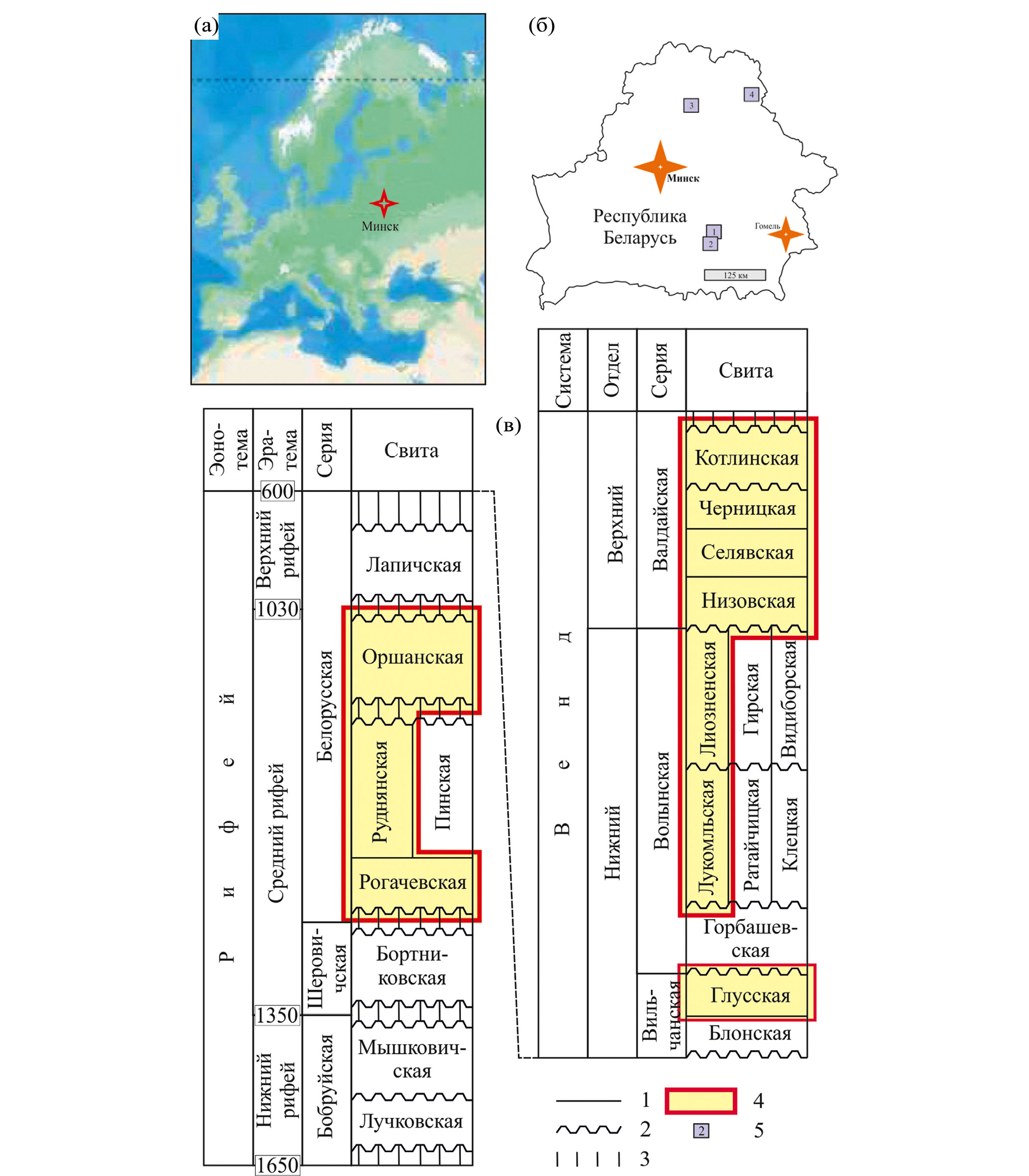 Широко распространенные на западе Восточно-Европейской платформы (ВЕП) в пределах Республики Беларусь верхнедокембрийские осадочные последовательности принадлежат и рифею, и венду [Махнач, 1966; Махнач и др., 1975 и др.; Геология …, 2001; Стратиграфические …, 2010; Kuzmenkova et al., 2018; Кузьменкова и др., 2019а, 2019б; Лапцевич и др., 2023; Стрельцова и др., 2023]. Рифей Беларуси, как и в стратотипическом разрезе на Южном Урале, разделен на три эратемы – нижне-, средне- и верхнерифейскую. Его породы несогласно, с крупным стратиграфическим перерывом залегают на кристаллическом фундаменте ВЕП. Также несогласно они перекрыты покровно-ледниковой формацией вильчанской серии, а в случае отсутствия последней – вулканогенными и вулканогенно-осадочными образованиями волынской серии венда.