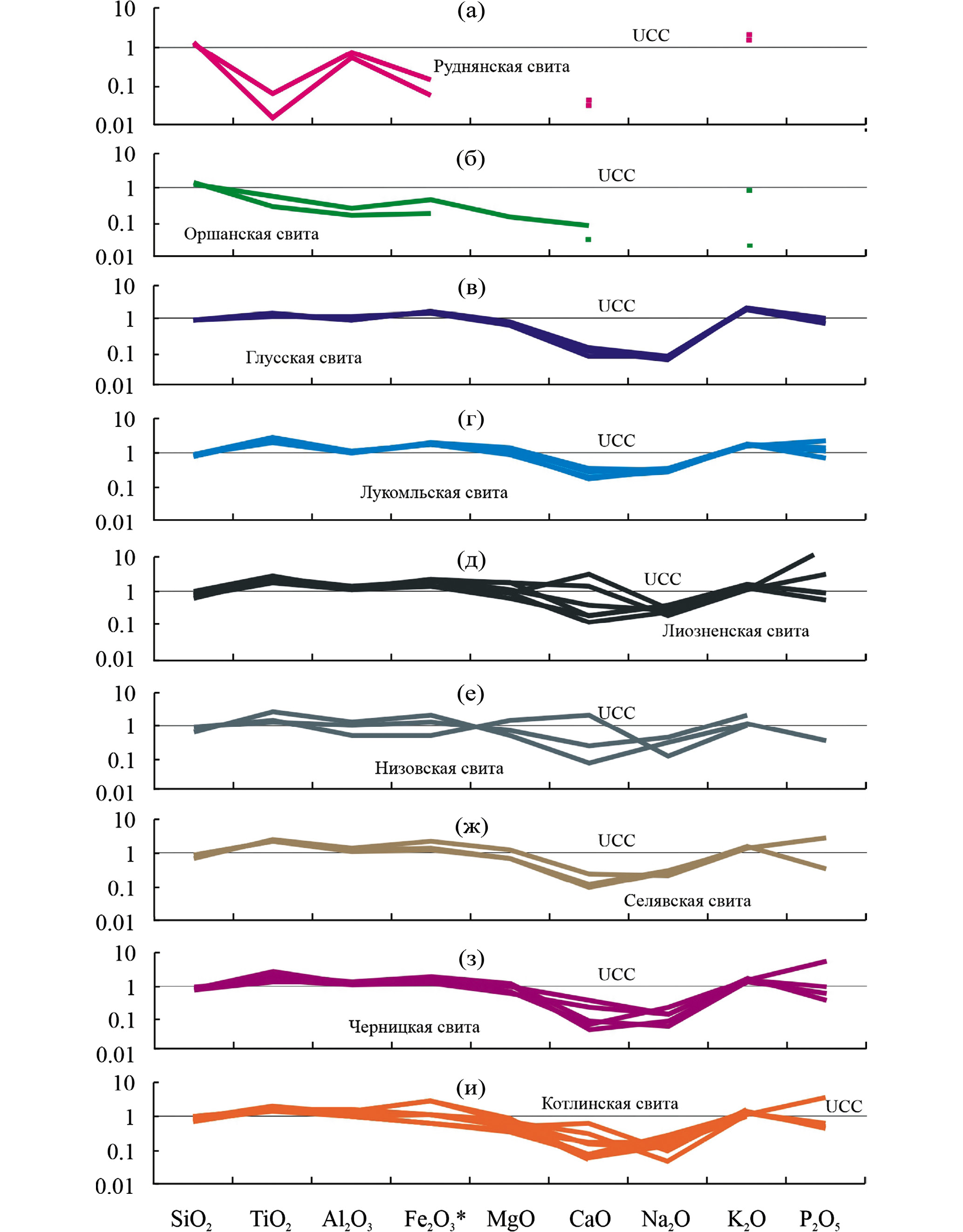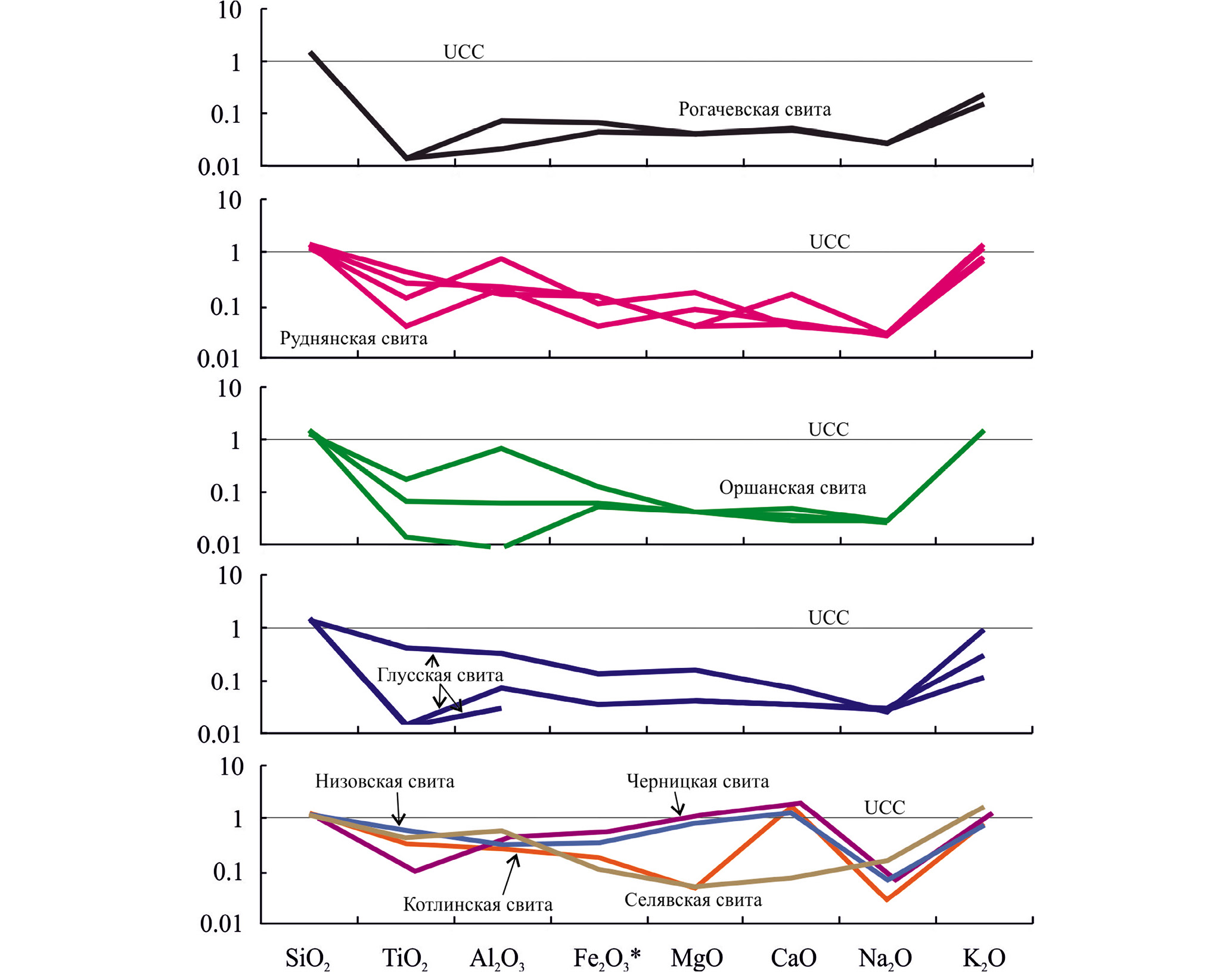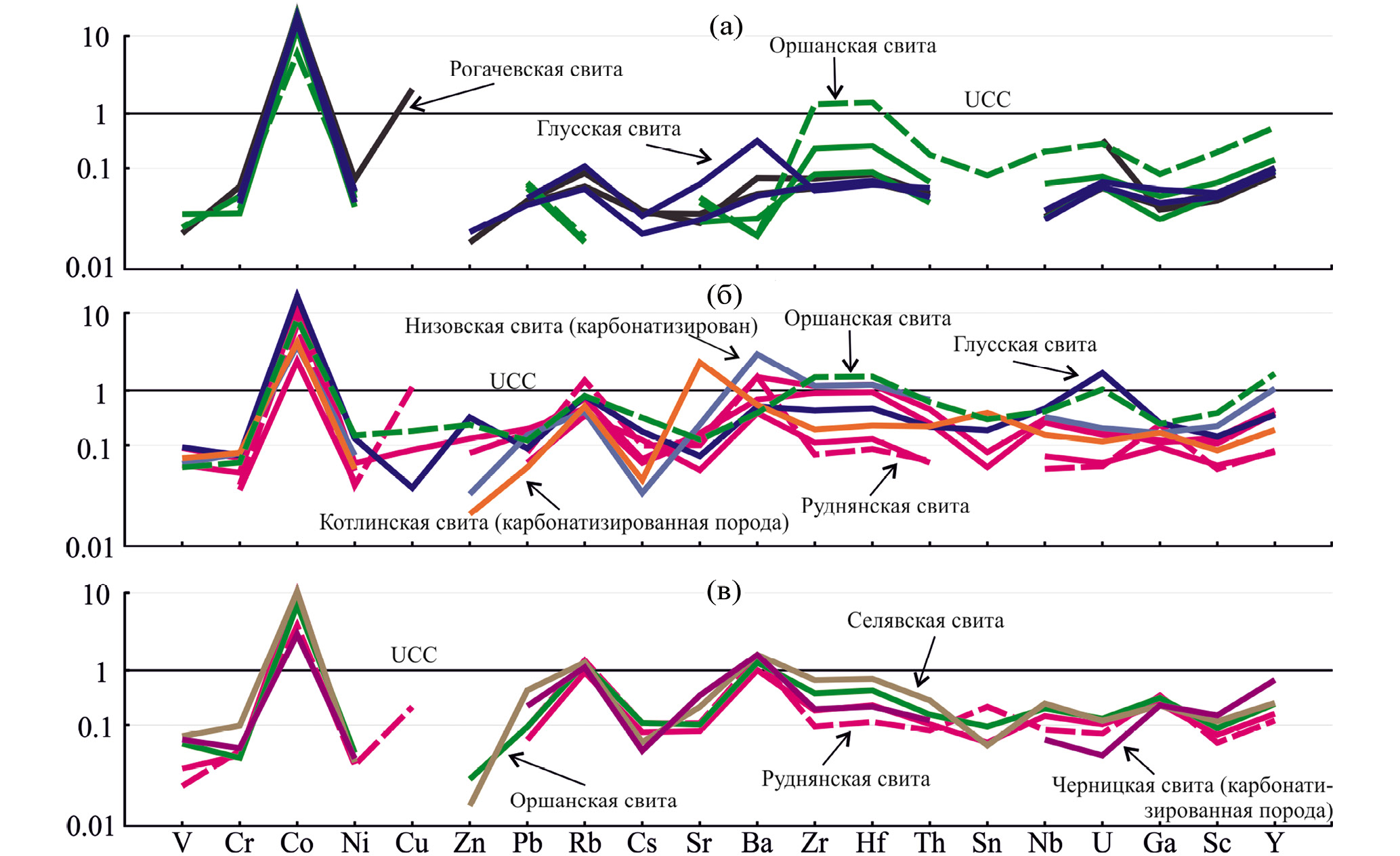 Рогачевская и руднянская свиты представлены, по данным [Kuzmenkova et al., 2018; Кузьменкова и др., 2019а, 2019б и ссылки там], отложениями мелководного эпиконтинентального в той или иной мере опресненного бассейна. Оршанская свита отражает этап накопления осадков в обстановках замкнутого мелководного внутриконтинентального с невысокой соленостью водоема. Основываясь на данных, приведенных в работах [Палеогеография …, 1980; Голубкова и др., 2022; Jewuła et al., 2022], можно сделать вывод, что формирование отложений венда на рассматриваемой территории происходило в основном в аллювиальных конусах, русловых и пойменных зонах, а также в прибрежных, в том числе лагунных, и мелководно-морских обстановках [Kuzmenkova et al., 2018; Лапцевич и др., 2023]. Осадки перечисленных обстановок в большинстве случаев могут в той или иной мере наследовать т.н. “провенанс-сигнал” – распределение ряда слаборастворимых в воде редких и рассеянных элементов (Th, La, Sc, Co, Cr, V и др.), а также их отношений, существовавшие в породах источников сноса [Taylor, McLennan, 1985; McLennan, 1989; McLennan et al., 1990, 1993; Интерпретация …, 2001; Geochemistry …, 2003; и др.]. Наиболее свойственно это тонкозернистым обломочным образованиям, содержащим значительную долю глинистого компонента.
