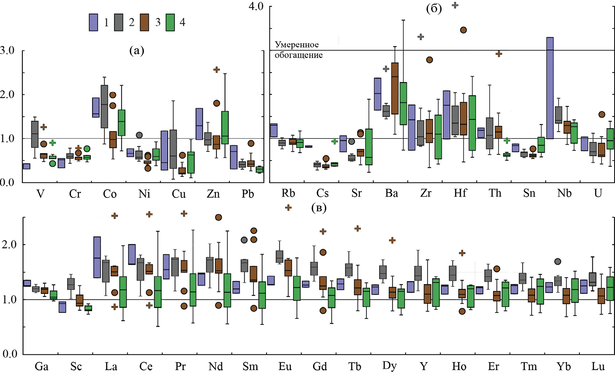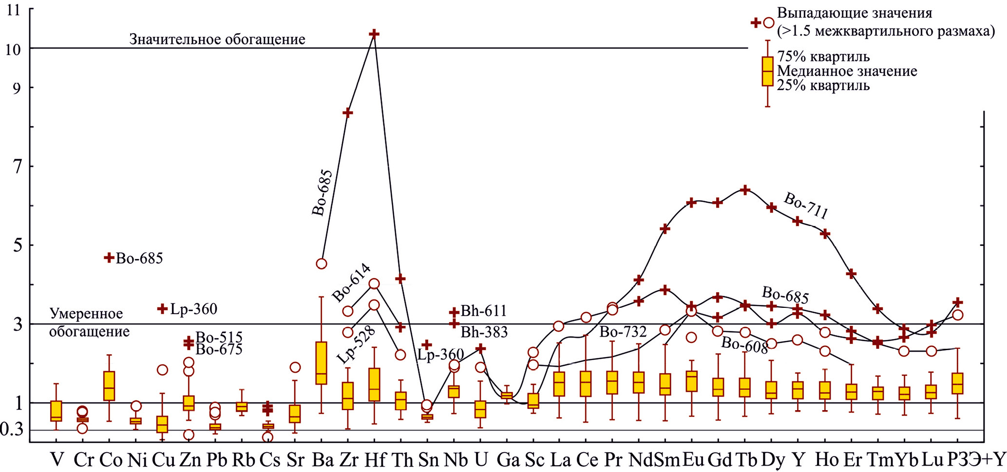 Содержание редких и рассеянных элементов установлено с использованием квадрупольного масс-спектрометра с индуктивно-связанной плазмой Agilent 7700x (ВСЕГЕИ, г. Санкт-Петербург). Нижние пределы определения концентраций элементов имели следующие значения: для Ва – 3, V – 2.5, Rb – 2, Cr, Ni, Sr, Pb и Zn – 1, Co, Zr и Nb – 0.5, Sc – 0.2, Ga, Y, Cs, Th и U – 0.1, La, Ce, Pr, Nd, Gd, Dy, Er, Yb и Hf – 0.01, Sm, Eu, Tb, Ho, Tm и Lu – 0.005 мкг/г. Особенности распределения названных элементов относительно различных референтных геохимических объектов рассмотрены ниже.