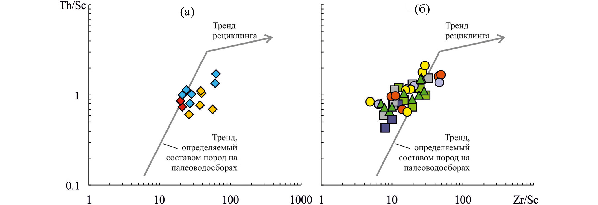 Во-вторых, по представлениям [McLennan et al., 1993], соотношение в тонкозернистых обломочных породах Zr, Sc и Th также позволяет судить о природе слагающего их материала. По критериям, представленным в этой публикации, можно сделать вывод о том, что в составе всех образцов преобладает материал первого седиментационного цикла (рис. 10), что в отношении глинистых пород волынской и валдайской серий запада ВЕП не противоречит данным [Jewuła et al., 2022]. Исключение составляют несколько образцов песчаников и алевролитов руднянской и оршанской свит среднего рифея – их фигуративные точки на графике Zr/Sc–Th/Sc явно отклоняются от линии тренда вариации состава пород источников сноса, что можно интерпретировать в пользу присутствия в них литогенной компоненты.