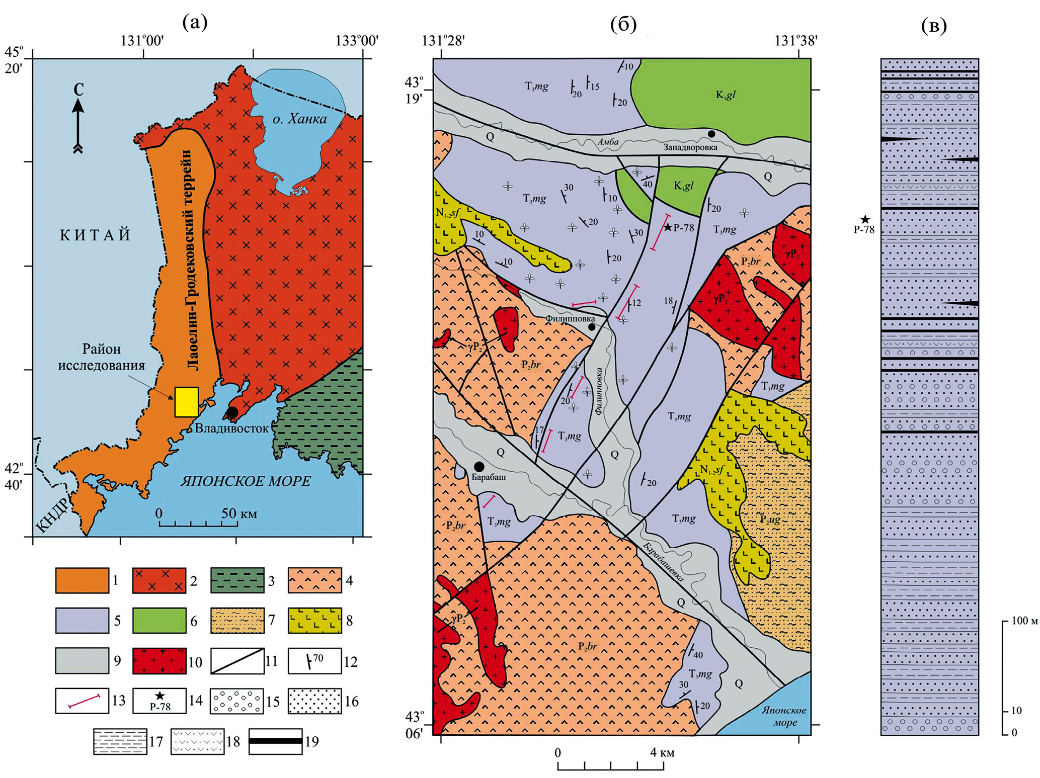 Рис. 1. Геологическая позиция Лаоелин-Гродековского террейна в тектонической структуре Юго-Западного Приморья (а); геологическая карта исследованного района (б); сводная стратиграфическая колонка отложений монгугайской свиты (в)