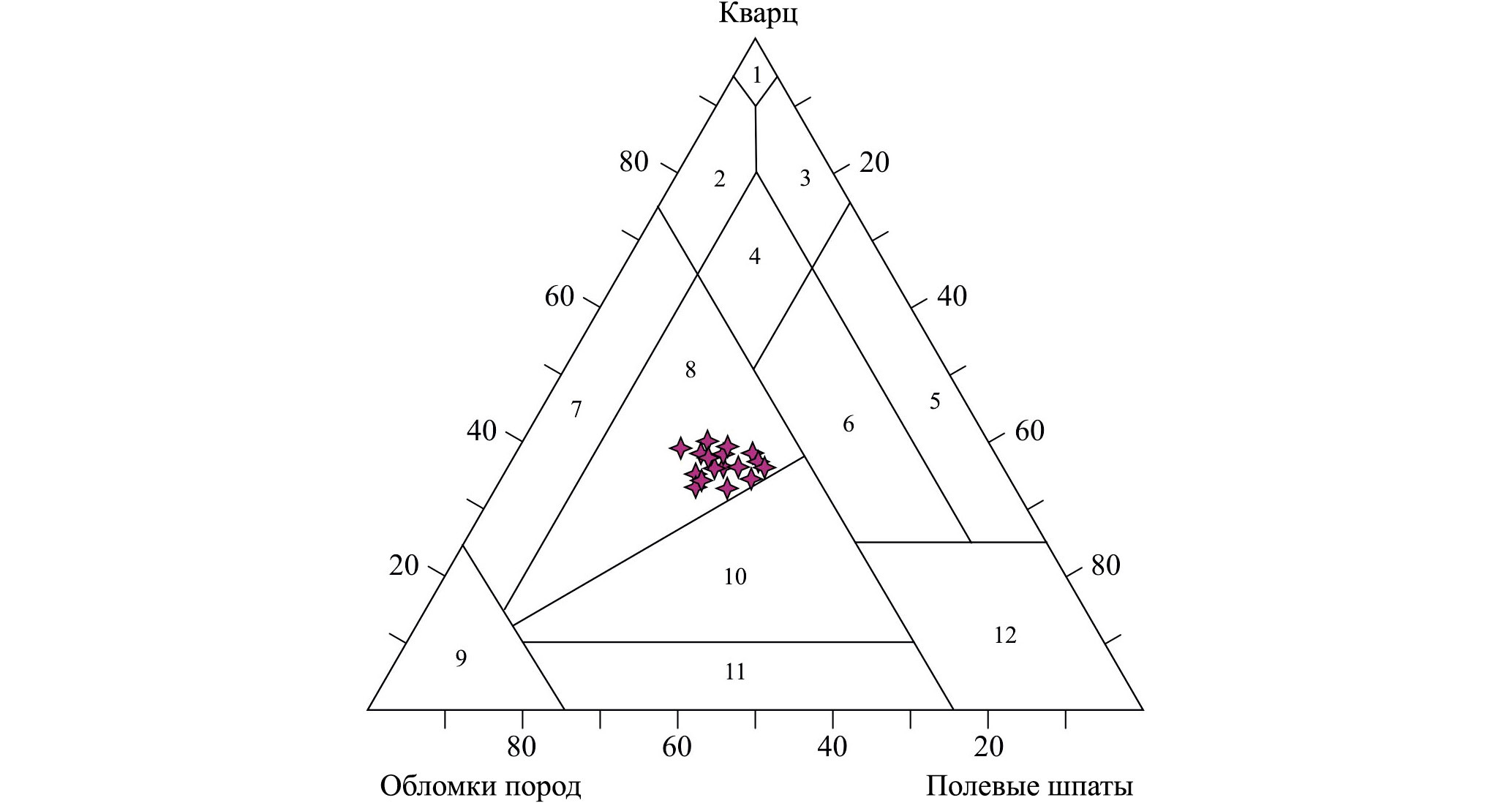 Поля типов песчаников: 1–4 – кварцевые песчаники (1 – мономиктовые кварцевые, 2 – кремнекластито-кварцевые, 3 – полевошпатово-кварцевые, 4 – мезомиктовые кварцевые); 5 – чистые или собственно аркозы; 6 – граувакковые аркозы; 7 – кварцевые граувакки; 8 – полевошпатово-кварцевые граувакки; 9 – собственно граувакки; 10 – кварцево-полевошпатовые граувакки; 11 – полевошпатовые граувакки; 12 – кристаллотуфы