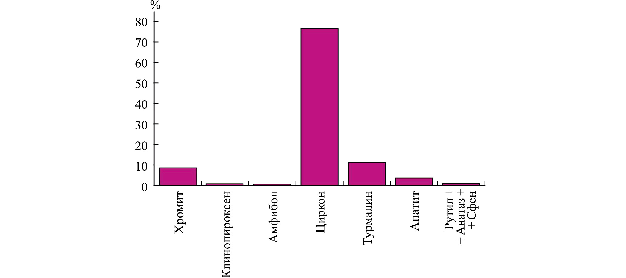 В песчаниках свиты изучен состав, содержание и соотношение между отдельными тяжелыми обломочными минералами и их ассоциациями (рис. 3). Были установлены две ассоциации тяжелых минералов. Наиболее распространена циркон–турмалин–апатит–рутил (сиалическая) ассоциация, связанная с разрушением кислых изверженных и метаморфических пород. В среднем сумма содержаний минералов ассоциации составляет 91% всех тяжелых минералов, а в отдельных пробах достигает 95–99%. В ассоциации доминирует циркон: в среднем 76%, а в некоторых пробах до 81–88%. Других минералов ассоциации значительно меньше: турмалина в среднем 11%, апатита 4%, а рутила не более 1%. Вторая хромит–пироксен–амфиболовая (фемическая) ассоциация, происходящая из основных и ультраосновных магматических пород, находится в резко подчиненном количестве, в сумме в среднем составляя 9%. Среди минералов ассоциации преобладает хромит – в отдельных пробах его до 30%. Содержания же амфибола и пироксена редко превышают 1%, находясь обычно в знаковых количествах.