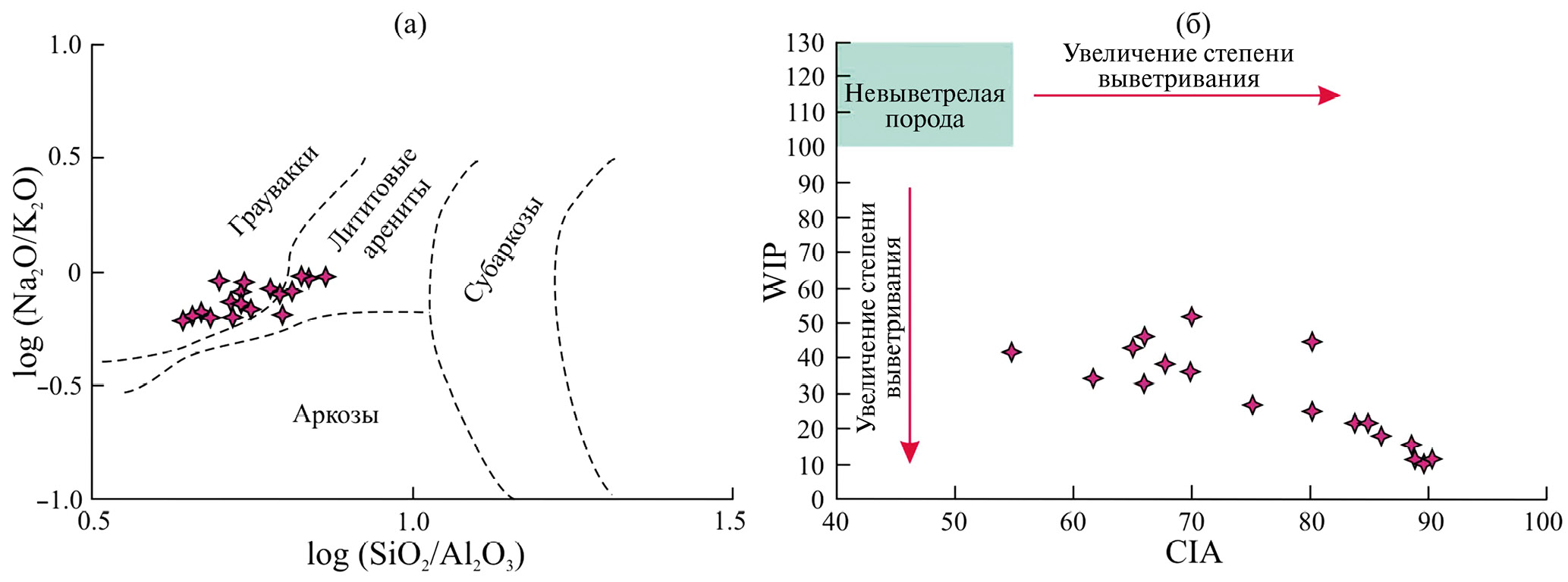 Рис. 4. Классификационная диаграмма log(Na2O/K2O)–log(SiO2/Al2O3), [Петтиджон и др., 1976] (а) и диаграмма степени химического выветривания CIA–WIP [Bahlburg, Dobrzinski, 2011] (б) для песчаных пород монгугайской свиты