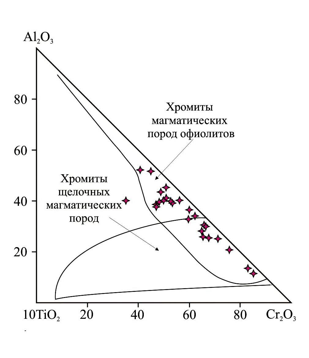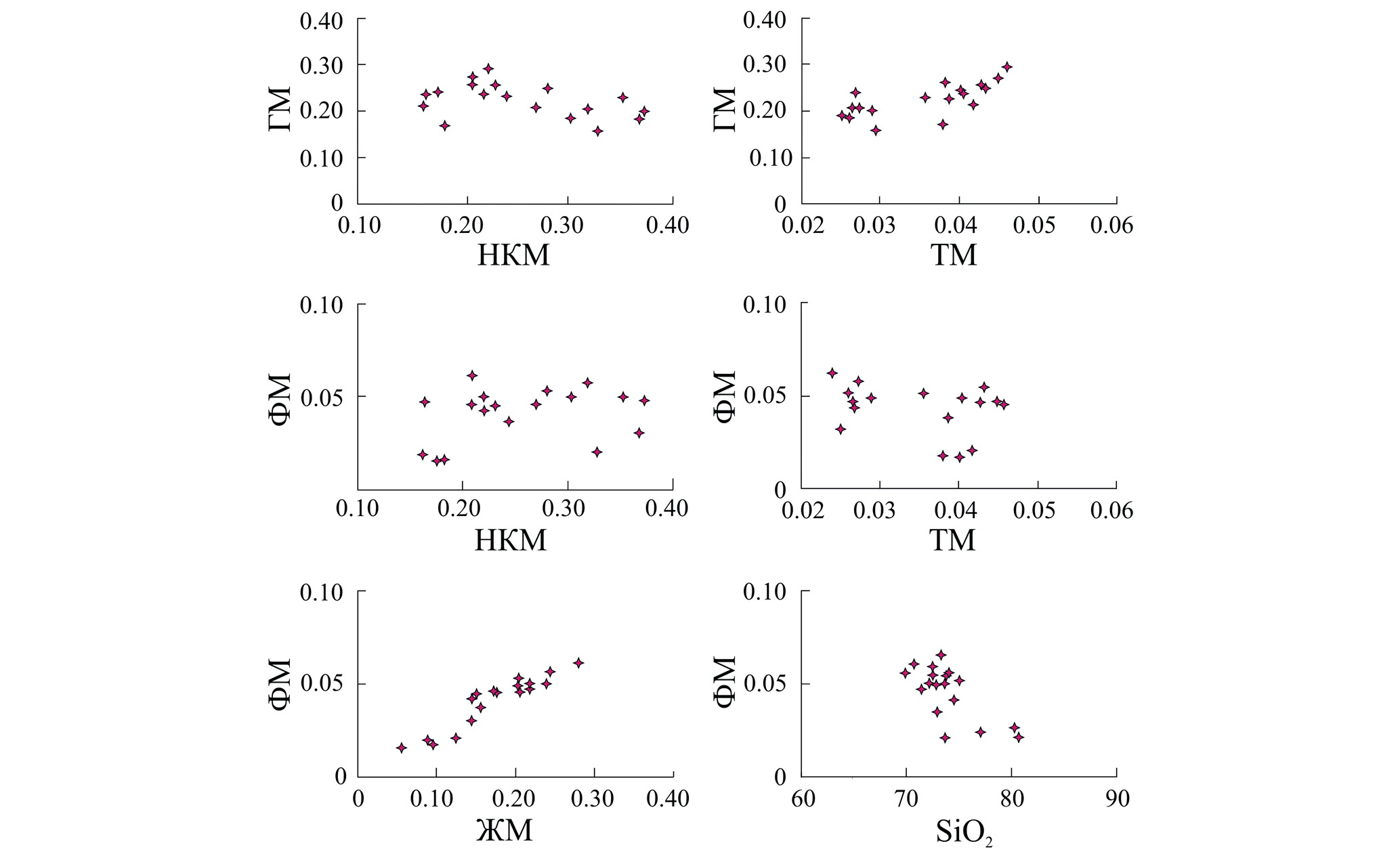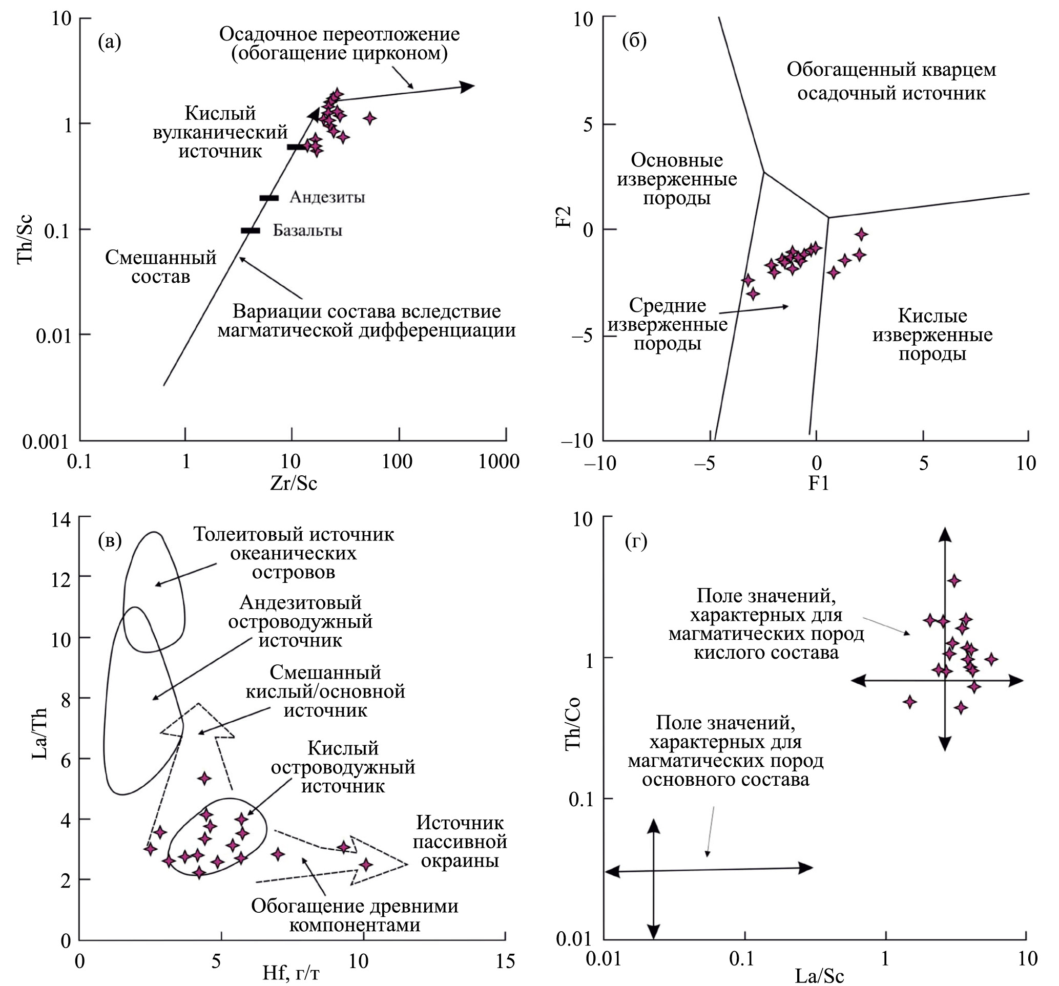Интерпретация геохимического состава песчаных пород свиты, при помощи ряда широко известных дискриминантных диаграмм, позволяет выявить типы геодинамических обстановок формирования отложений [Bhatia, 1983; Bhatia, Crook, 1986; Roser, Korsch, 1986; Verma, Armstrong-Altrin, 2013]. На диаграммах М. Бхатия и А. Крука [Bhatia, 1983; Bhatia, Crook, 1986] (см. рис. 13б‒13ж), предназначенных для разграничения песчаных пород из бассейнов различных тектонических обстановок, фигуративные точки пород свиты группируются, главным образом, в полях бассейнов активных континентальных окраин, включающих в себя, в понимании авторов и окраины, осложненные сдвиговыми дислокациями по трансформным разломам. Значительно реже точки песчаников попадают, либо приближаются к полям бассейнов, сопряженных с окраинно-континентальными магматическими дугами, а также бассейнов пассивных континентальных окраин. Такое смещение точек, вероятно, объясняется влиянием на накопление отложений различных частей бассейна продуктами размыва местных источников питания: с одной стороны массивов гранитоидов, а с другой – подстилающих свиту основных и средних вулканитов среднепермской барабашской свиты. Более определенно состав пород интерпретируется на диаграмме K2O/Na2O–SiO2, [Roser, Korsch, 1986] (см. рис. 13з). На ней изученные породы практически полностью ложатся в поле бассейнов, сопряженных с активными континентальными окраинами, и лишь отдельные точки попадают в поле бассейнов пассивных окраин. На диаграмме DF1–DF2, применяющейся для интерпретации состава пород с высоким содержанием кремнезема (SiO2 >63%) [Verma, Armstrong-Altrin, 2013] (см. рис. 13и), фигуративные точки триасовых песчаников ложатся преимущественно в поле бассейнов, связанных с рифтогенными (вероятно трансформными) [Маслов и др., 2019; Sengör, Natal'in, 2001], а также, частично, коллизионными и островодужными обстановками. В целом же, генетическая интерпретация геохимического состава песчаных пород монгугайской свиты свидетельствует об их формировании в геодинамических обстановках, соответствующих бассейнам активных континентальных окраин, вероятно, осложненных сдвиговыми дислокациями по трансформным разломам.