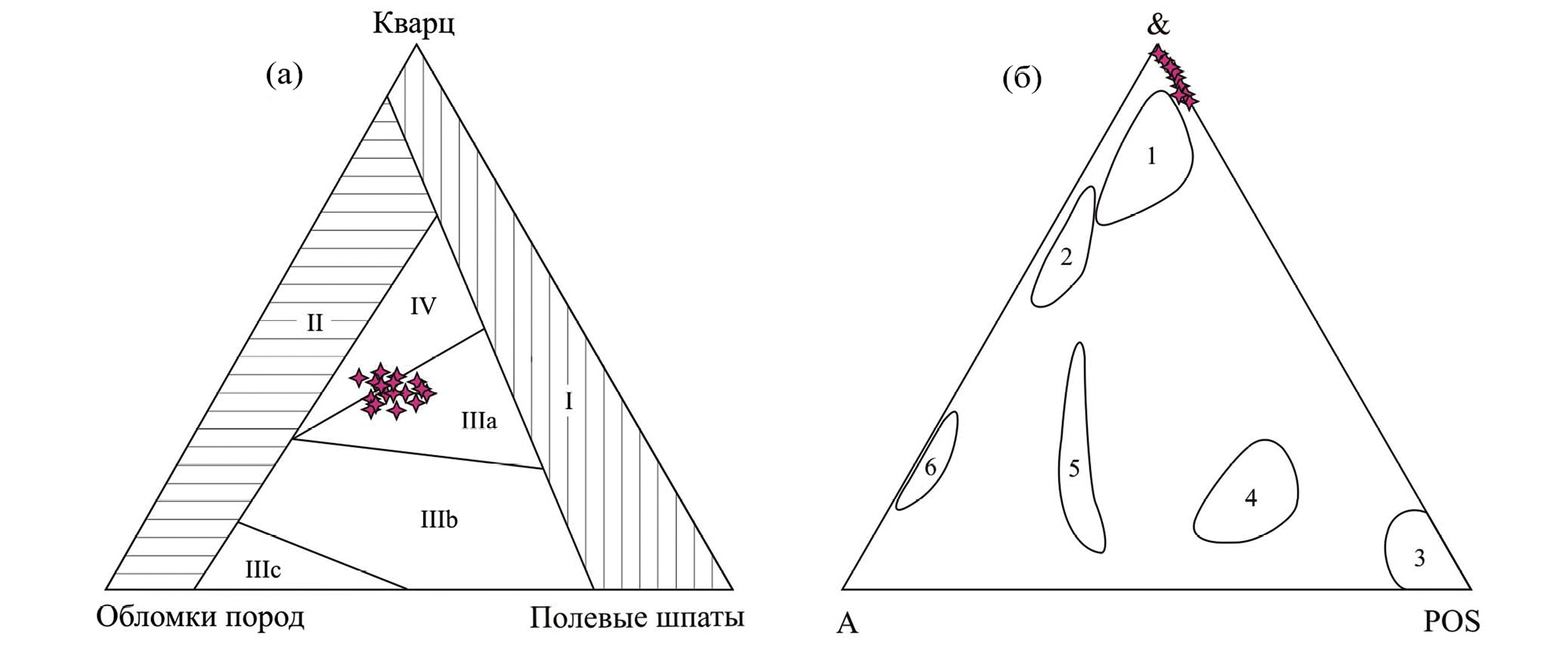 По соотношению породообразующих компонентов изученные песчаники однотипны и относятся к полимиктовым. Их обломочная часть содержит от 33 до 40% кварца. Преобладают изометричные монокристаллические зерна с волнистым погасанием, поликристаллические разности встречаются редко. Количество полевых шпатов варьирует от 21 до 33%, причем это в основном кислые плагиоклазы – альбит и олигоклаз (55–85% всех полевых шпатов). Доля калиевых полевых шпатов в редких случаях достигает 30%, а основные и средние плагиоклазы малочисленны. Обломки пород в сумме составляют 31–41%. Среди них чаще всего встречаются фрагменты осадочных (25–51% всех обломков), а также средних и кислых магматические пород (10–49%). Кремнистые и метаморфические породы редки. На классификационной диаграмме В.Д. Шутова [1967] (рис. 2) точки песчаников свиты группируются в поле полевошпатово-кварцевых граувакк.