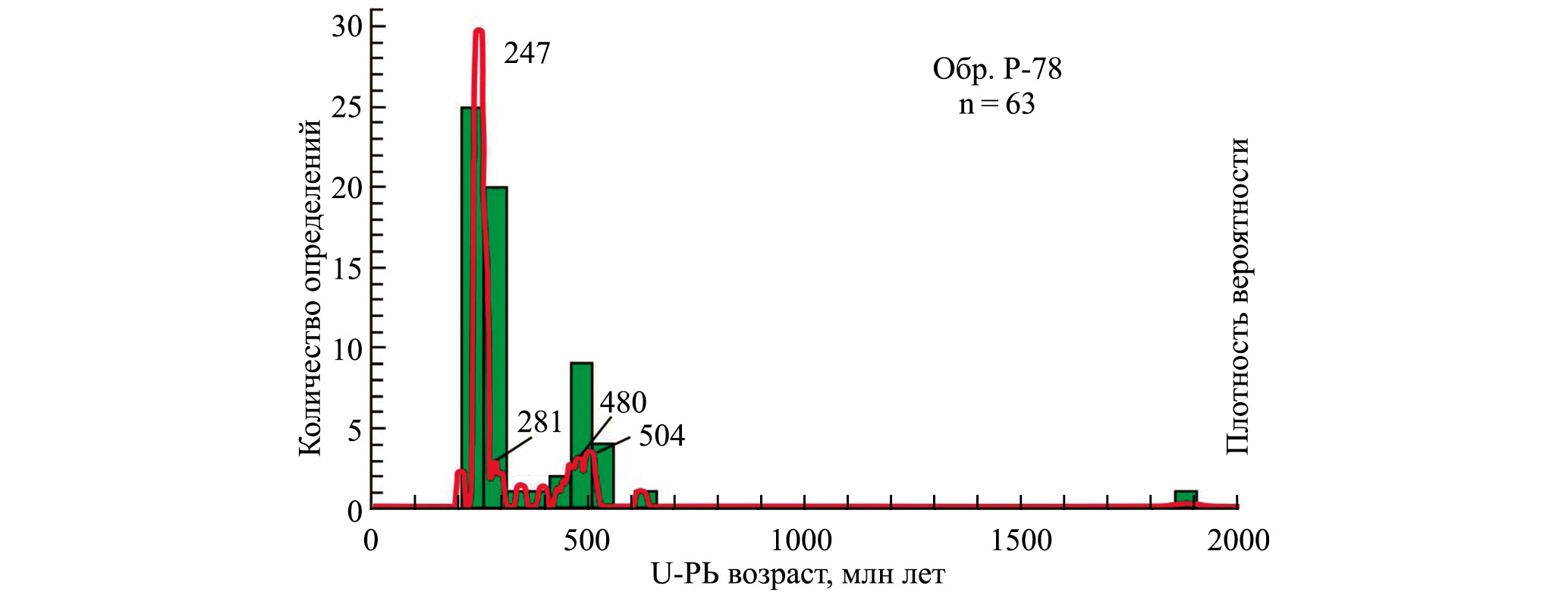 Из 111 изученных цирконов, извлеченных из песчаников свиты, конкордантными оказались датировки 63 зерен, с диапазоном возрастов от 240 до 1781 млн лет (см. табл. 4). Исследования показали, что наиболее многочисленную популяцию (70% всех зерен) образуют цирконы с возрастами от 293 до 240 млн лет (пермь–средний триас). На кривой относительной вероятности возраста основной максимум отвечает значению 247 млн лет, а второстепенный – 281 млн лет (см. рис. 12). Обращает на себя внимание, что возраст самых “молодых” изученных цирконов (240–251 млн лет, 41%) достаточно близок, но не моложе биостратиграфического возраста свиты [Бурий, 1968; Волынец, Шорохова, 2007; Триас …, 2004]. В подчиненном количестве (23%) встречаются цирконы среднекембрийского–ордовикского возраста (510–447 млн лет) с максимумами в 504 и 480 млн лет. В виде единичных зерен встречаются цирконы с раннедевонскими (395 млн лет), раннесилурийскими (434 млн лет) и позднепротерозойскими (612 млн лет) возрастами.