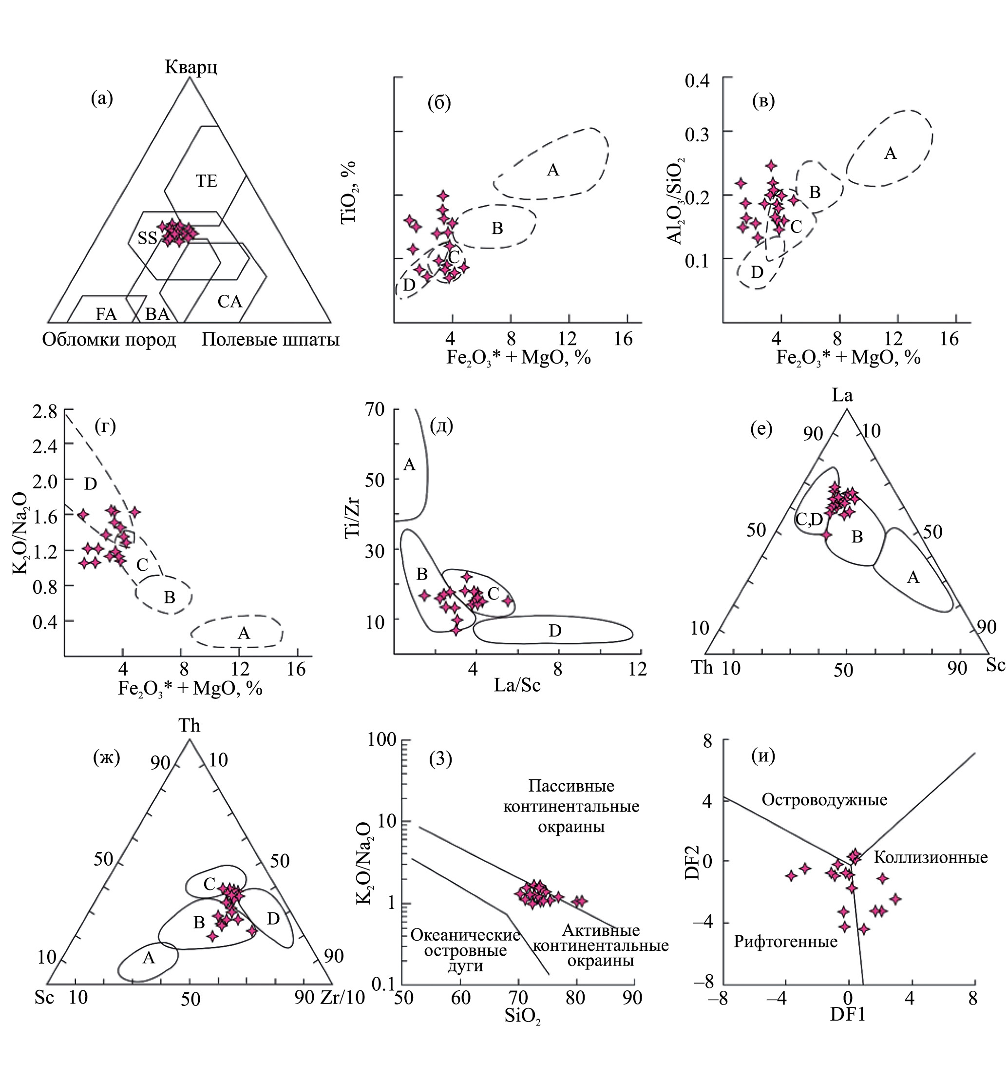 б–и – по геохимическому составу песчаников на диаграммах: а–ж –типов седиментационных бассейнов [Bhatia, 1983; Bhatia, Crook, 1986]. Поля бассейнов, сопряженных: А – с океаническими, В – с континентальными островными дугами, С – с активными, D – с пассивными континентальными окраинами. Fe2O3* – общее железо; з – бассейновых обстановок SiO2–K2O/Na2O [Roser, Korsch, 1986]; и – возможных типов геодинамических обстановок для высококремнистых пород DF1–DF2 [Verma, Armstrong-Altrin, 2013]