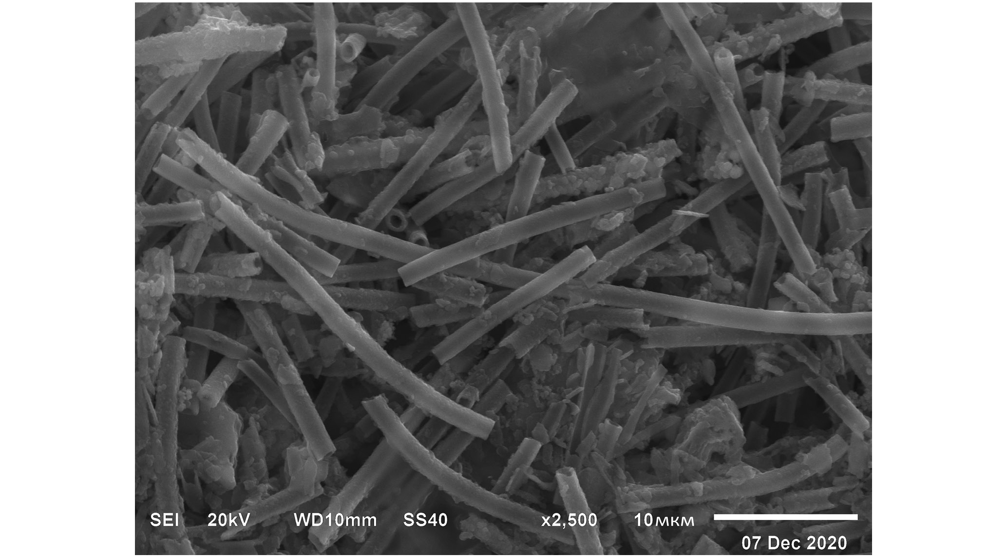 Рис. 1. Оксигидроксиды железа, покрывающие клетки Leptothrix ochracea, локация Скачки, образец Sk-1-А. Изображения получены с помощью растрового электронного микроскопа JSM-6510LA (Japan), оснащенного спектрометром JED-2200 (JEOL)