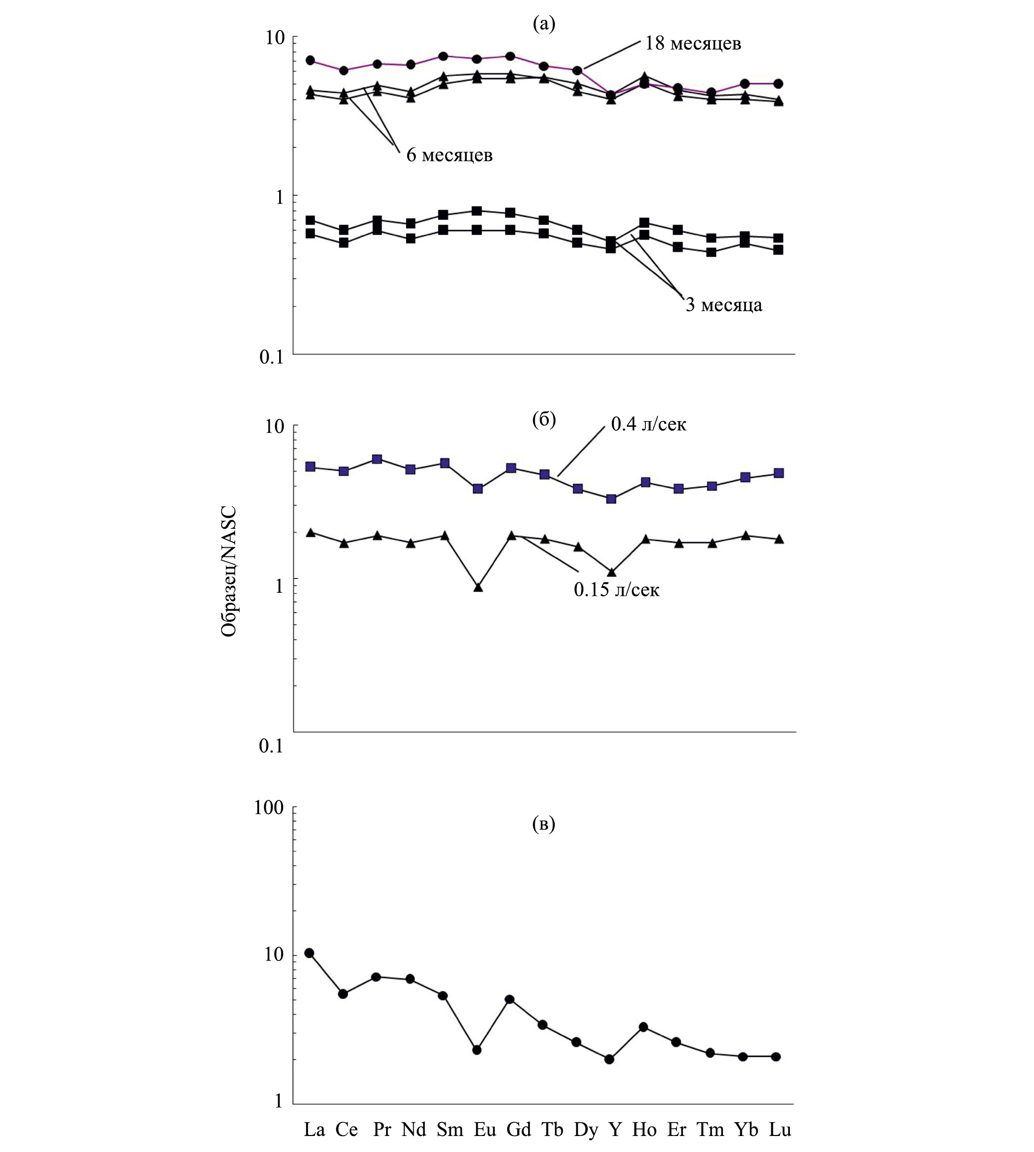 Содержание РЗЭ в NASC ‒ из работы [Gromet et al., 1984]. Указаны возраст бактериальных матов в локации Скачки (а) и расход воды (л/с) в локации оз. Орлинское (б). Возраст мата из локации р. Сестра Заводская составляет не менее двух лет