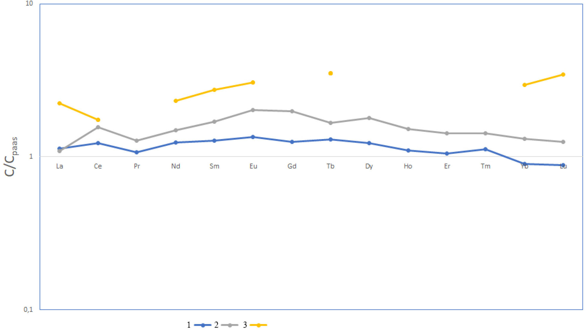 Рис. 1. Состав РЗЭ в глинистых отложениях плейстоцена Индийского и Атлантического океанов, нормализованные на состав РЗЭ в PAAS. 1 – гемипелагические глины Индийского океана; 2 – пелагические глины Атлантического океана; 3 – пелагические глины Индийского океана.