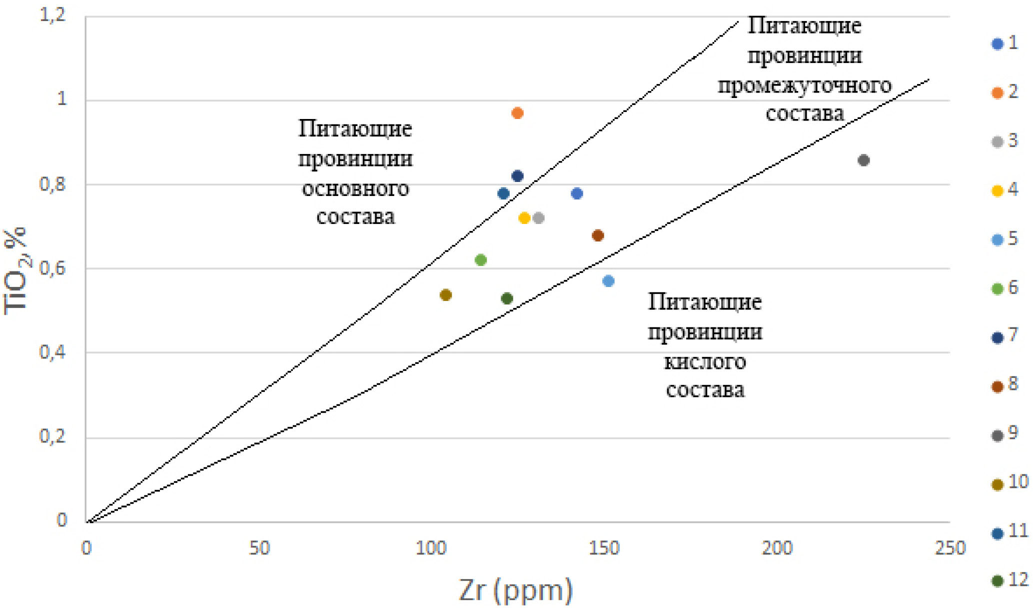 Рис. 2. Реконструкция петрофонда для разных типов осадков Индийского и Атлантического океанов по величине отношения ТiO2/Zr [Bracciali et al., 2007]. 1 – пелагические глины Индийского океана; 2 – гемипелагические глины Индийского океана; 3 – терригенные турбидиты Индийского океана; 4 – бескарбонатное вещество кокколитовых илов и глин Индийского океана; 5 – бескарбонатное вещество кокколитово-фораминиферовых илов и глин Индийского океана; 6 – средняя составляющая плейстоцена Индийского океана; 7 – пелагические глины Атлантического океана; 8 – гемипелагические глины Атлантического океана; 9 – терригенные турбидиты Атлантического океана; 10 – бескарбонатное вещество кокколитовых илов и глин Атлантического океана; 11 – бескарбонатное вещество кокколитово-фораминиферовых илов и глин Атлантического океана; 12 – средняя составляющая плейстоцена Атлантического океана.