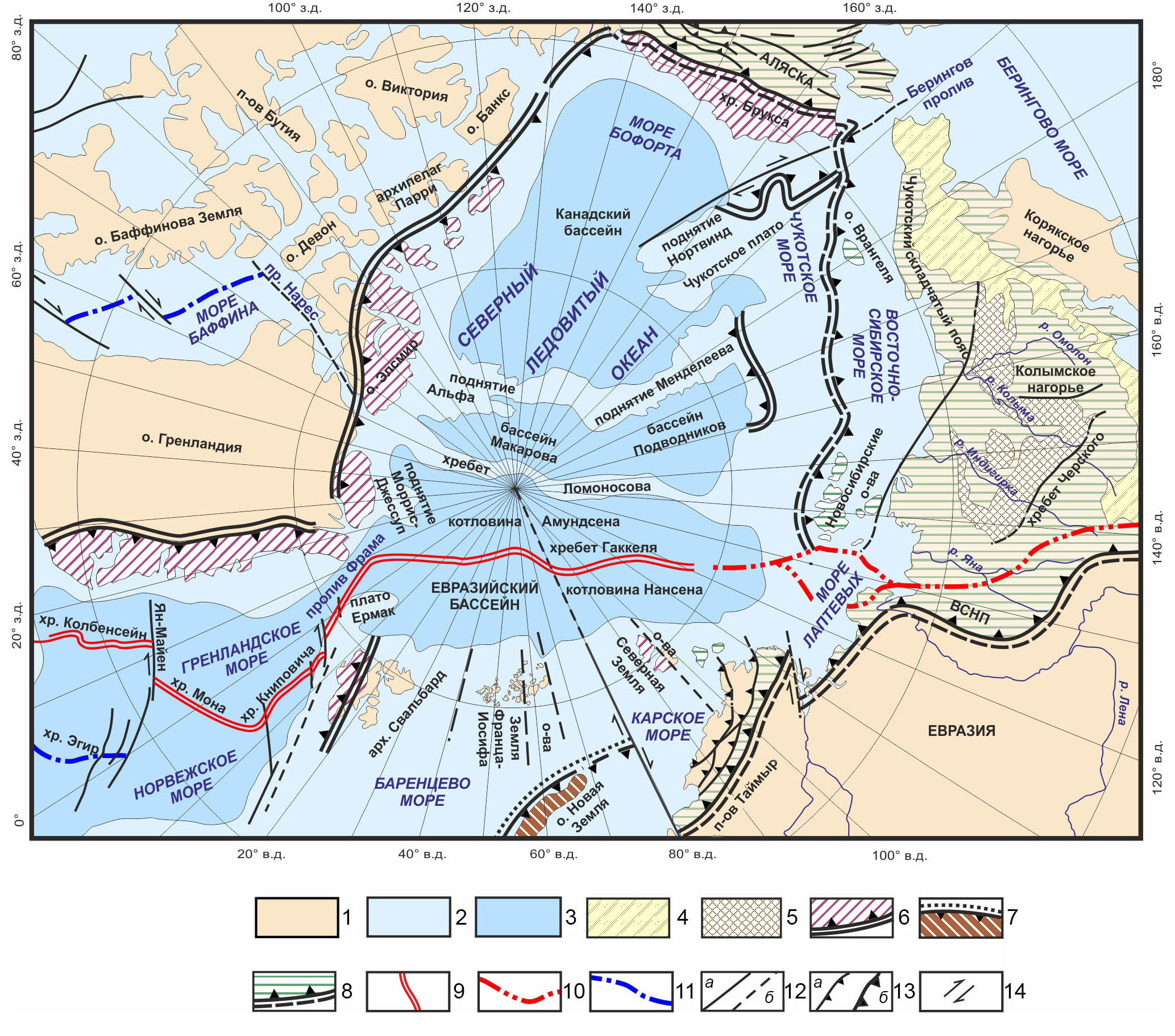 1 – суша; 2, 3 – акватории: 2 – с изобатой до 500 м, 3 – с изобатой свыше 500 м; 4, 5 – мезозойские структуры: 4 – Охотско-Чукотский вулканический пояс, 5 – Колымская структурная петля; 6–8 – фронты складчатости и области их распространения: 6 – каледонской и элсмирской, 7 – герцинской, 8 – мезозойской; 9, 10 – структуры рифтогенеза и повышенной сейсмичности: 9 – океанические, 10 – континентальные; 11 – отмершие оси спрединга; 12 – разломы: а – установленные, б – предполагаемые; 13 – надвиги: а – локальные, б – региональные; 14 – сдвиги.