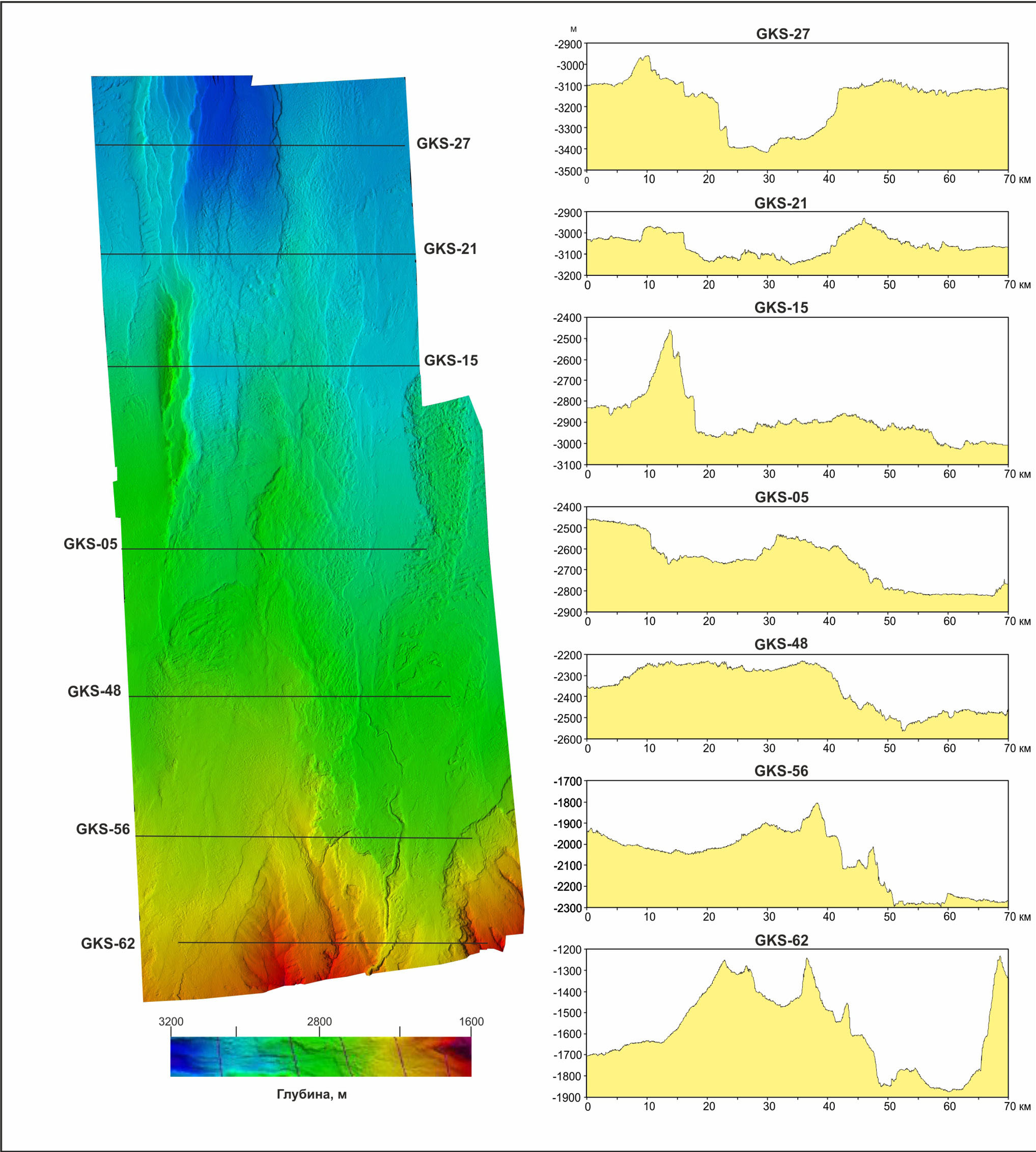 От широты профиля GKS–05 бровка западного уступа прослеживается в северо-западном направлении примерно по изобате 2500 м. В сечении профиля рельефа дна GKS–15 перепад глубин от бровки борта депрессии до основания склона составляет не менее 500 м. На самом склоне отчетливо выделяются две террасы (ступени), вдоль простирания которых наблюдаются участки крупных оползней (обвалов).