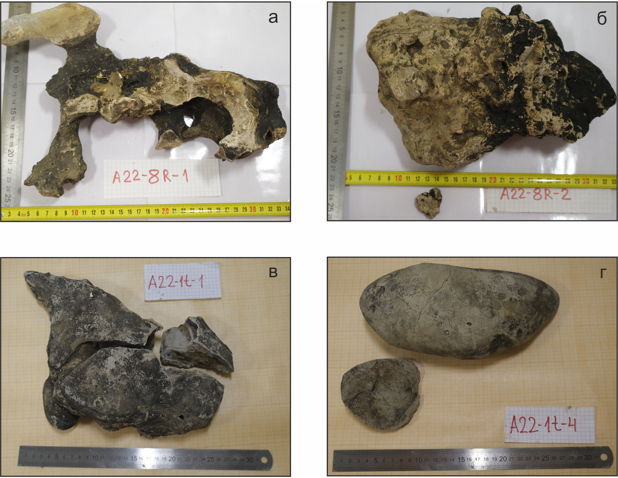 Морфология, размер и места нахождение карбонатов очень изменчивы (рис. 4). Некоторые карбонаты по форме напоминают оленьи рога (см. рис. 4а), другие не имеют доминирующей ориентировки (см. рис. 4б) или уплощены и напоминают межпластовые конкреции (см. рис. 4в). Размеры карбонатов по длинным осям достигают 25–30 см. Наиболее крупный из поднятых образцов, напоминающий уплощенную трубку, составляет 50 × 20 × 10 см (образец А22-10R1 из ПО-4).