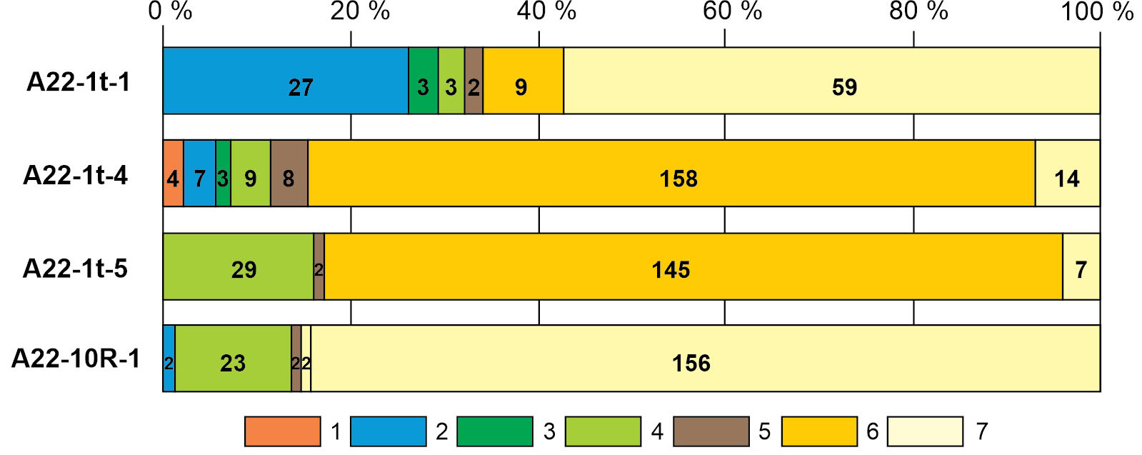 Рис. 5. Распределение палиноморф разного возраста в изученных образцах. Цифрами внутри диаграмм показано количество учтенных для статистики экземпляров. 1 – пермь–юра (пыльца); 2 – ранняя юра (диноцисты); 3 – нижний мел (диноцисты, споры); 4 – поздний мел (диноцисты, пыльца); 5 – палеоген (диноцисты); 6 – кайнозой (пыльца); 7 – неоген/квартер (пыльца).