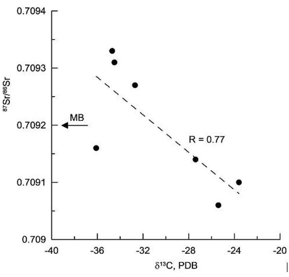 Отрицательная корреляция значений δ13С и отношений 87Sr/86Sr (рис. 6) подтверждает участие в образовании аутигенных карбонатов хребта Гаккеля как минимум двух источников диагенетических флюидов.