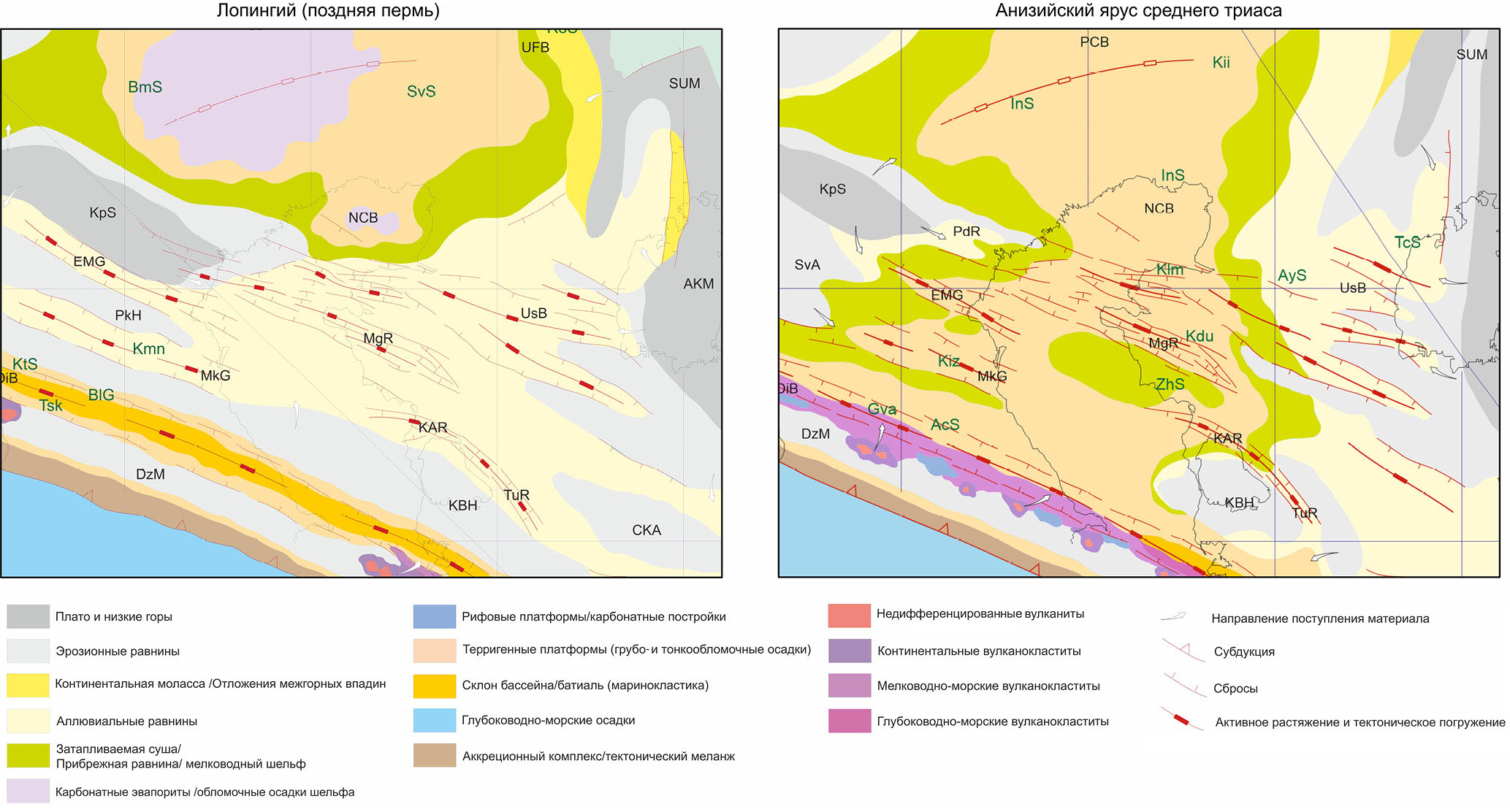 Currently, the Permian and Triassic deposits represent a folded complex, unconformably overlying the pre-Kungurian deposits. Triassic deposits of the Scythian and West Turanian plates are disturbed by faults with an amplitude of up to 2 km, and are dislocated in areas. Folding with faults and strike-slip faults is especially intense on the Karpinsky Ridge. Increased dislocation and Late Triassic magmatism on the Scythian and West Turanian plates are associated with collision processes during the closure of the Paleotethys ocean.