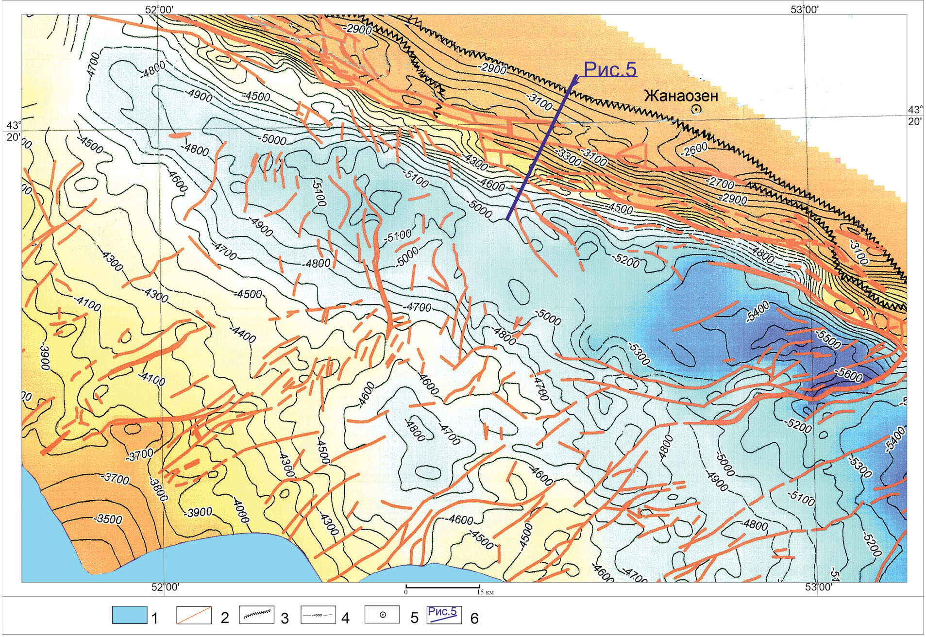 1 – Каспийское море, 2 – разрывные нарушения, 3 – граница выхода среднетриасовых отложений на предъюрскую поверхность, 4 – изогипсы среднетриасовых отложений (м), 5 – районный центр, 6 – положение профиля, показанного на рис. 5.