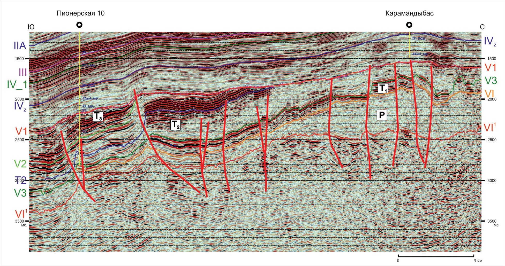 Рис. 5. Сейсмический разрез (фрагмент) через Жетыбай-Узеньскую ступень (Пионерская‒Карамандыбас).
