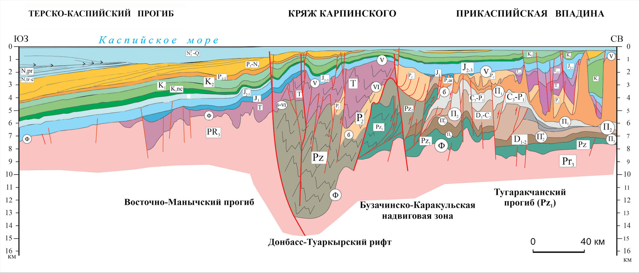 Основными тектоническими единицами Каспийского региона являются Прикаспийская впадина с мощностью осадочного чехла до 20‒22 км, восточная часть Скифской плиты и Западно-Туранская плита с мощностью осадочного чехла до 12 км. Наиболее крупными структурными элементами осадочного чехла рассматриваемой части Скифской плиты являются Карпинско-Мангышлакская и Туаркырская системы поднятий, Карабогазский свод, Терско-Каспийский, Южно-Мангышлакский и Манычские прогибы. В таких границах по нашим представлениям Скифская плита получает четкие структурные ограничения, характеризуется однотипным разрезом осадочного чехла и фундаментом (байкальским), единой геодинамической историей (активная окраина Восточно-Европейского континента в среднем и позднем палеозое и триасе), общими чертами нефтегазоносности (рис. 1, 2).