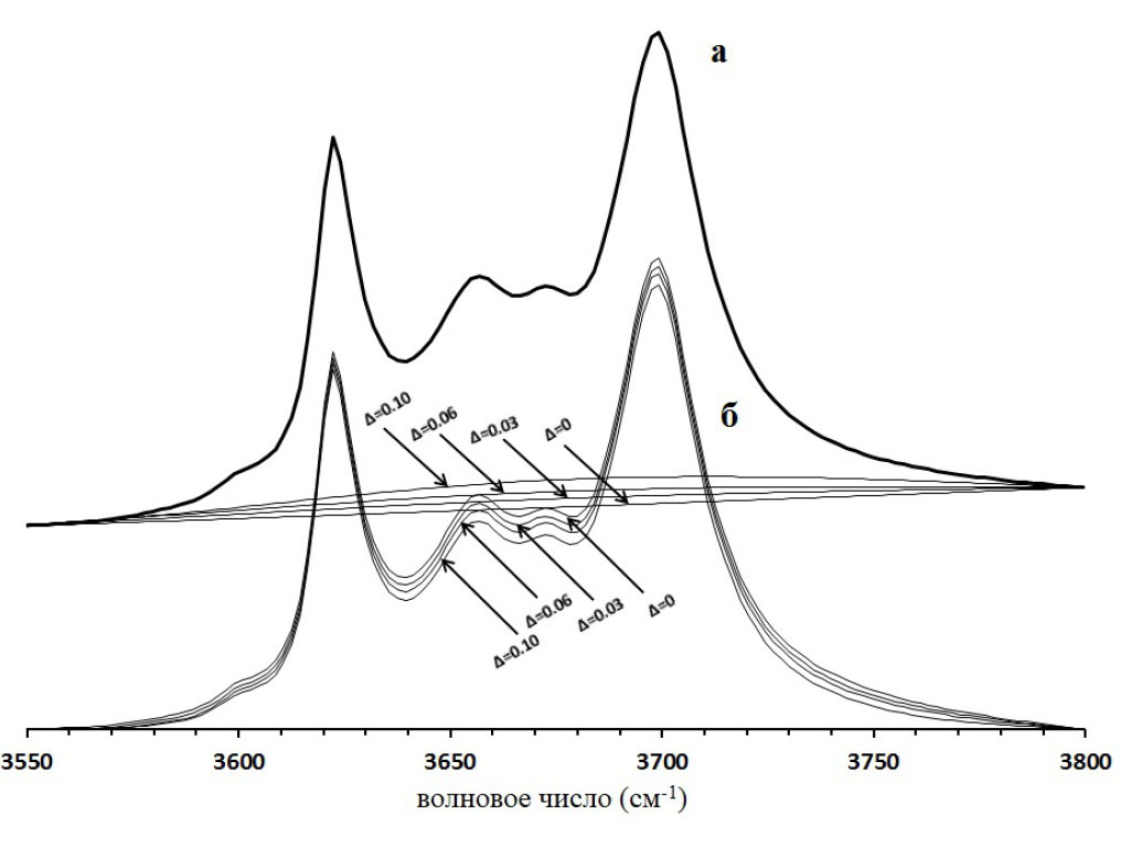 Она и будет определять рабочий фрагмент ИК-спектра для его последующего разложения. Оптимальная величина превышения Δ может быть найдена методом подбора. В большинстве случаев, найденная оптимальная величина Δ обеспечивает попадание точек, соответствующих отношениям спектроскопических параметров изучаемого образца на всех трех графиках (см. рис. 1а, 1б, 1в) в пределы, ограниченные сплошными линиями.