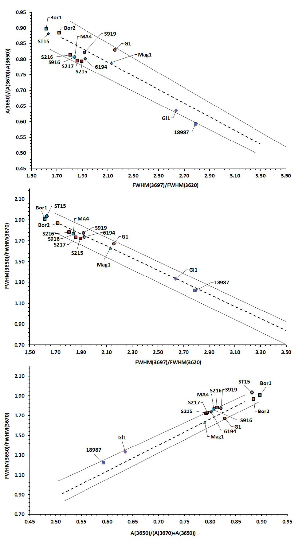 FWHM(ν3)/FWHM(ν2) = 2.636 -0.4437, R2 = 0.947. (6)