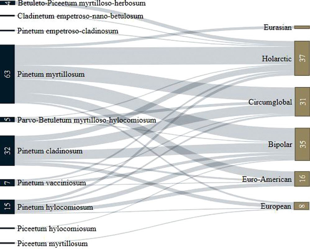 The paper is devoted to ecological and biodiversity studies on basidiomycetes associated with common juniper (Juniperus communis) from subtaiga zone of Belarus as well as several taiga regions of the European part of Russia, namely, the Leningrad Region, the Republic of Karelia, the Komi Republic, the Arkhangelsk Region, the Murmansk Region. The taiga zone represents an ecological-coenotic optimum of common juniper and the widest spectrum of its fungal consorts is expected to be revealed. A total of 96 species of wood-inhabiting basidiomycetes, both from dead and living wood, were recorded in association with J. communis in the boreal regions of Belarus and the European part of Russia. These species belong to the Pucciniomycetes (Pucciniales, 3 species), Dacrymycetes (Dacrymycetales, 1 species), and Agaricomycetes (Agaricales, Atheliales, Auriculariales, Boletales, Cantharellales, Gloeophyllales, Gomphales, Hymenochaetales, Polyporales, Russulales, Thelephorales, Trechisporales, 92 species). An annotated species list is given, including an expanded substratum and ecology datasets. The ecological and geographical preferences of these fungi and the strength of their connection with juniper were analyzed by thermal map, clusterization, and Sankey diagram methods. The various types of wood decomposition by juniper-associated basidiomycetes were discussed. The global distribution pattern of the species was analyzed. It was concluded that the biota of basidiomycetes associated with juniper in Eastern European taiga forests is a heterogeneous and heterochronous formation, where it is possible to distinguish clearly a florogenetically ancient core of the species specialized on juniper, exhibiting in one or other way biotrophic properties, and several taiga sets of species (suites) connected with pine trees and their litter as well as with spruce-pine-leaved taiga mosaics and boreo-nemoral mosaics typical of the Northern Hemisphere.