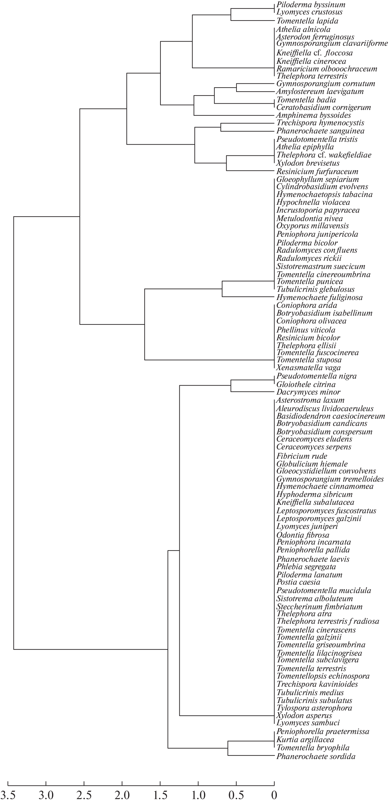 - Zmitrovich I.V., Shchepin O.N., Malysheva V.F. et al. Basidiome reduction in litter-inhabiting Thelephorales in boreal forest environments: morphological and molecular evidence. Current Res. Environm. Appl. Mycol. 2018. V. 8 (3). P. 360–371. https://doi.org/10.5943/cream/8/3/7