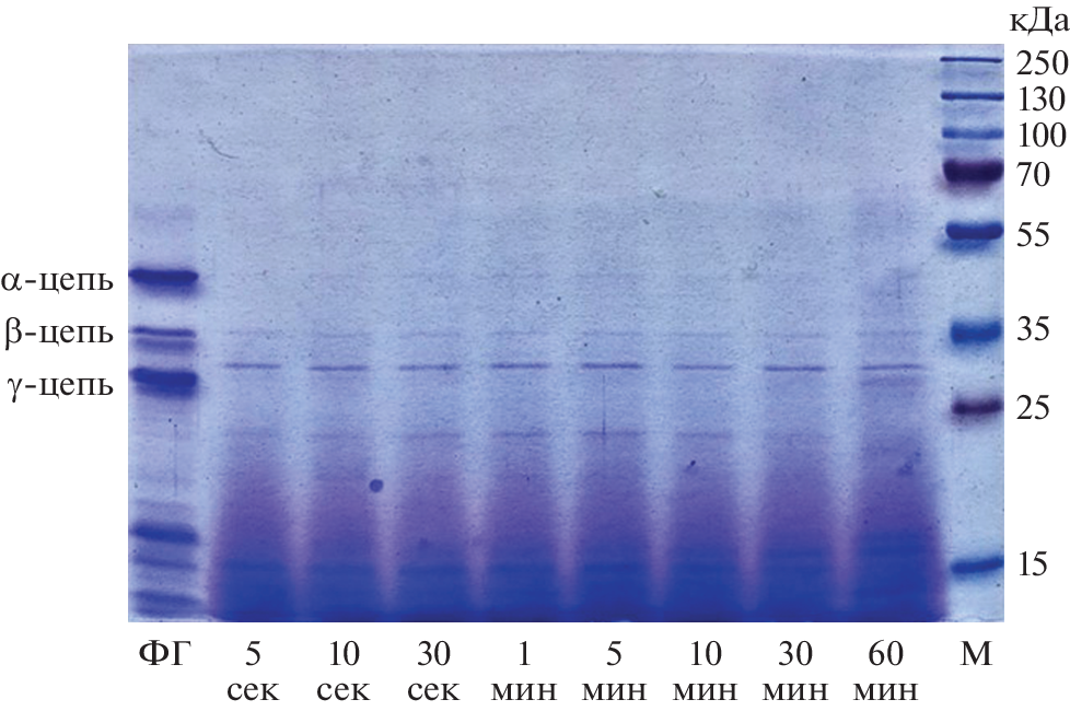 Proteolytic cleavage of fibrin and fibrinogen under the action of proteases of microfungi Aspergillus alliaceus 7dN1 and A. terreus 2 was carried out. It was shown that both enzymes can have strong α-fibrinogenase and moderate β-fibrinogenase activity, practically without affecting the γ-chains of these molecules. The products of cleavage in the time interval up to 60 min are polypeptides with a molecular weight of 15 kDa or less.