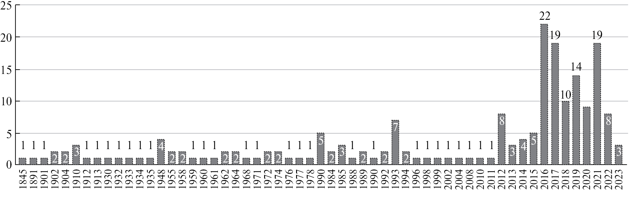 Рис. 1. Столбчатая диаграмма, демонстрирующая количество новых видов Talaromyces (или их базионимов), описанных в период с 1845 по 2023 г.