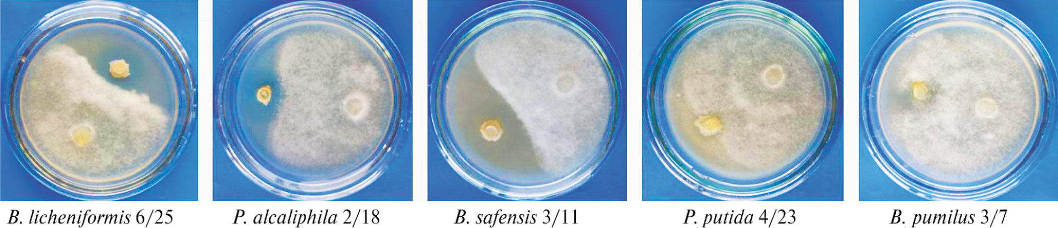 Из литературы известна способность представителей бактерий родов Bacillus, Pseudomonas и Streptomyces и нек. др. подавлять рост Ph. infestans за счет широкого разнообразия образуемых ими метаболитов, токсичных для оомицета (Chen et al., 2017; Hashemi et al., 2022; Trang Le Vu Khanh et al., 2020; Caulier et al., 2018). Bacillus и Pseudomonas в дополнение к защитным функциям способны стимулировать рост растений (Chen et al., 2017). Грибы рода Trichoderma также используются в качестве агентов биоконтроля; их действие на патогенный организм включает множество механизмов, таких как конкуренция за питательный субстрат, синтез антибиотиков, микопаразитизм и индукция защитных сил растений (Shoresh et al., 2010; Yao et al., 2016; Kariuki et al., 2020).